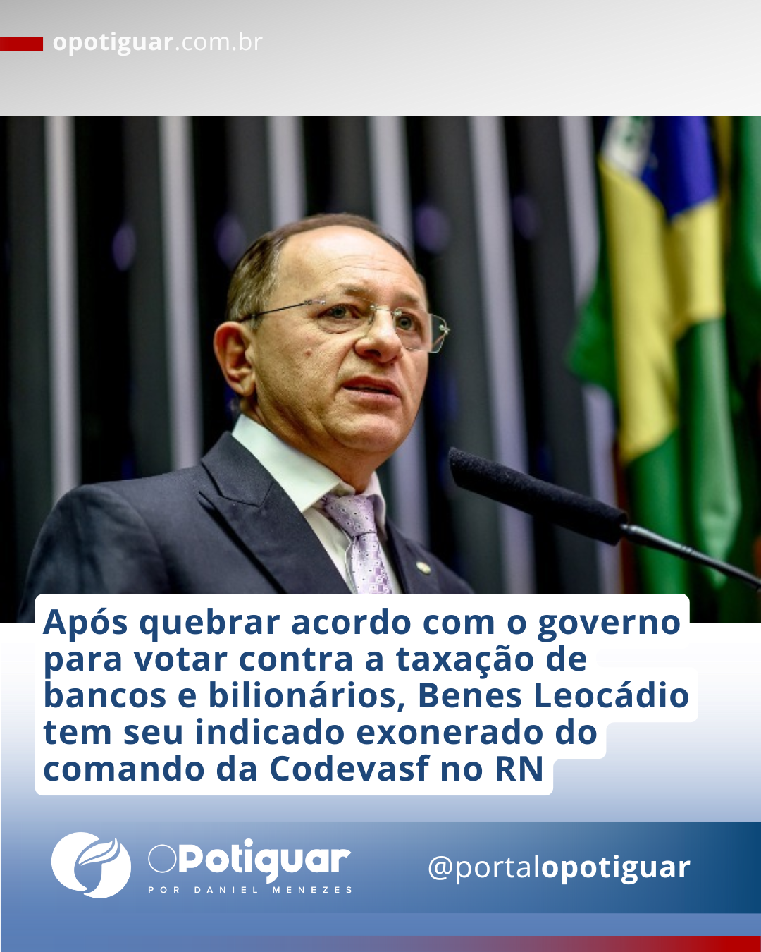 Após quebrar acordo com o governo para votar contra a taxação de bancos e bilionários, Benes Leocádio tem seu indicado exonerado do comando da Codevasf no RN
