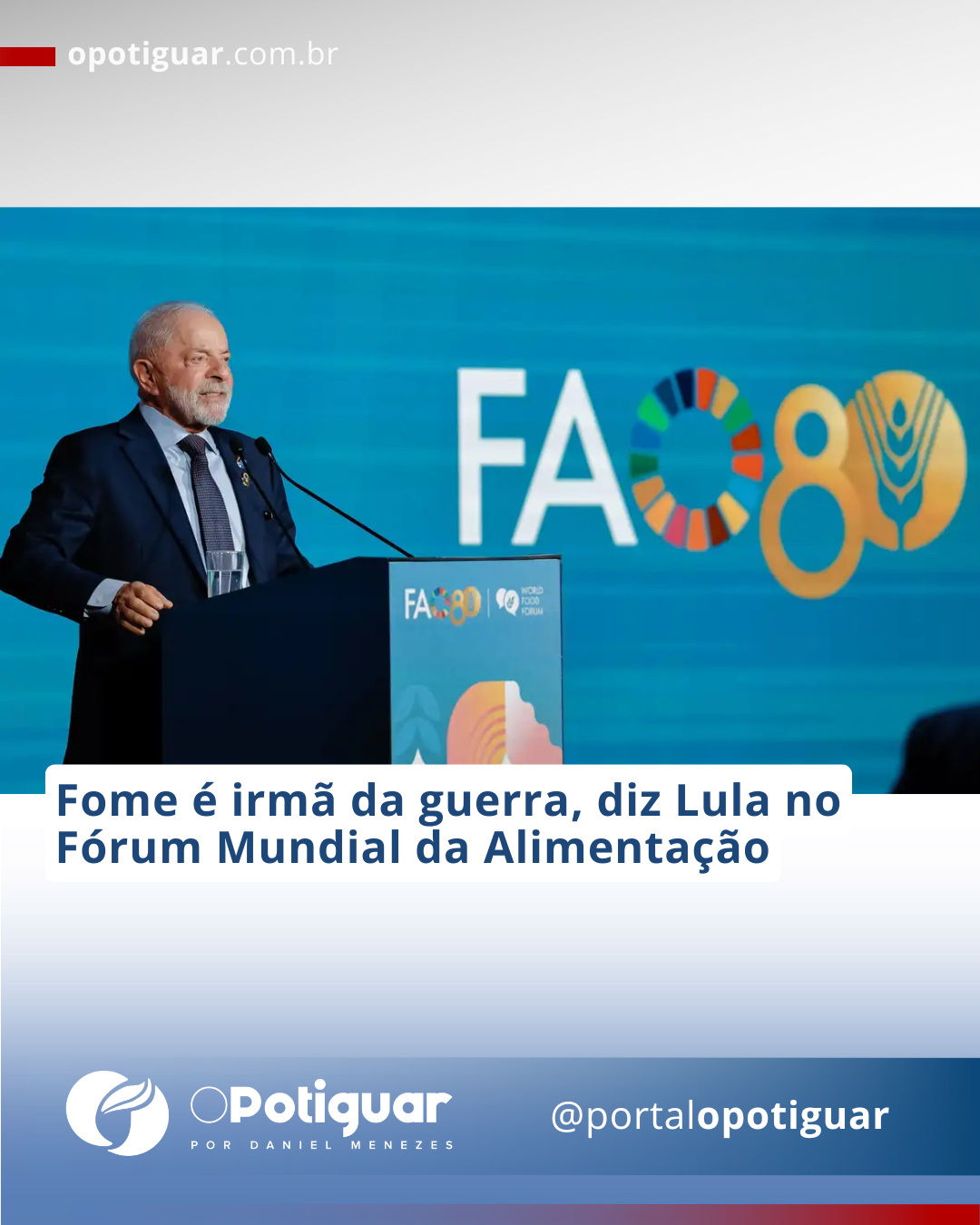 Ao participar da abertura do Fórum Mundial da Alimentação, em Roma, o presidente Luiz Inácio Lula da Silva disse nesta segunda-feira (13) que “a fome é irmã da guerra”. “Seja ela travada com armas e bombas ou com tarifas e subsídios”.