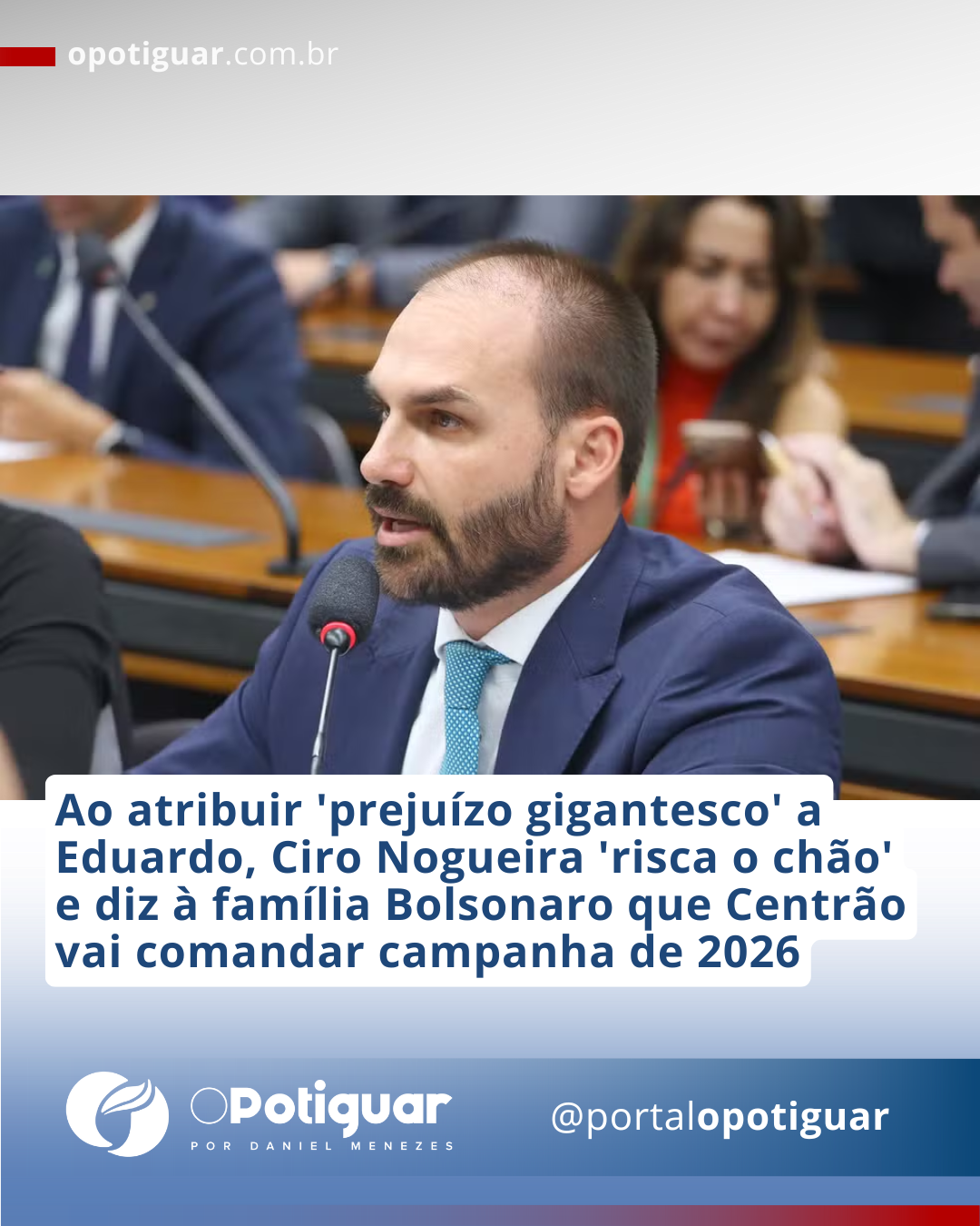 G1 - Ao dizer publicamente que o deputado federal Eduardo Bolsonaro (PL-SP) causou um prejuízo muito grande para 2026, o senador Ciro Nogueira (PP-PI) expõe o que ele e outros líderes do Centrão já vinham repetindo nos bastidores: que o filho do ex-presidente Jair Bolsonaro (PL) já atrapalhou demais e que, daqui para frente, será o Centrão que comandará a campanha da oposição para a eleição presidencial de 2026.