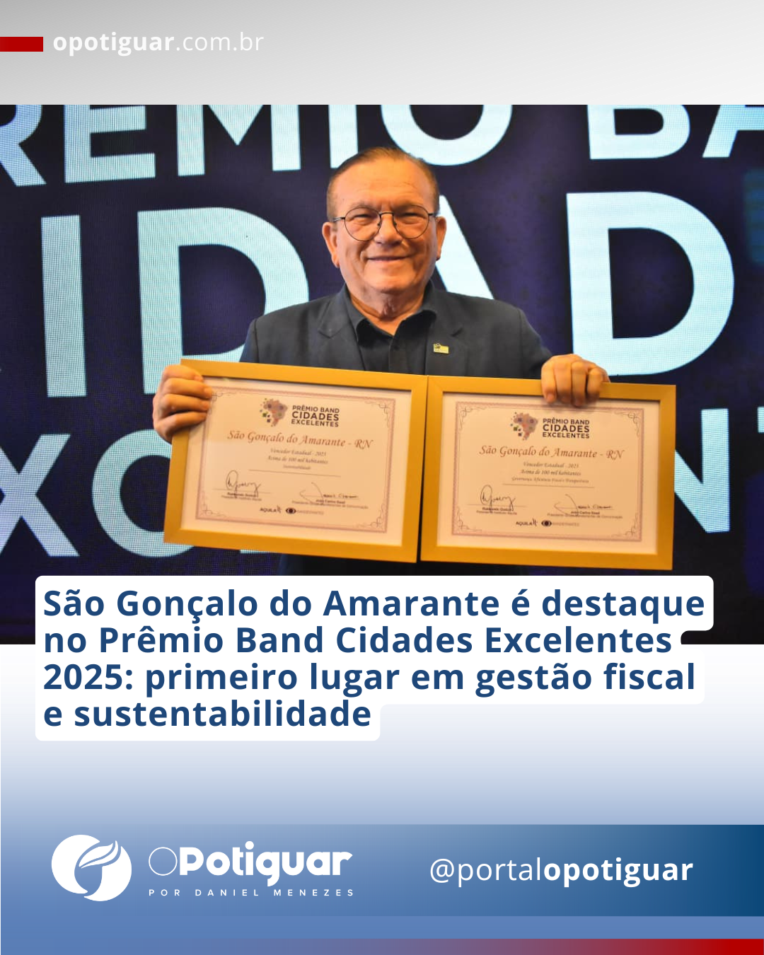 O município de São Gonçalo do Amarante foi um dos grandes destaques do Prêmio Band Cidades Excelentes, na noite desta terça-feira (14), conquistando o 1º lugar na categoria "Governança, Eficiência Fiscal e Transparência" e 1° lugar no pilar da "Sustentabilidade", entre os municípios com mais de 100 mil habitantes, consolidando-se como referência em boas práticas de gestão fiscal e desenvolvimento sustentável.