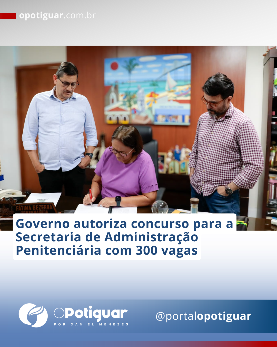 A governadora Fátima Bezerra assinou, nesta segunda-feira (20), a autorização para a realização de um concurso público da Secretaria de Estado da Administração Penitenciária (Seap). O concurso oferecerá 300 vagas, sendo 200 para policiais penais, 60 para especialistas em assistência penitenciária e 40 para cargos administrativos.