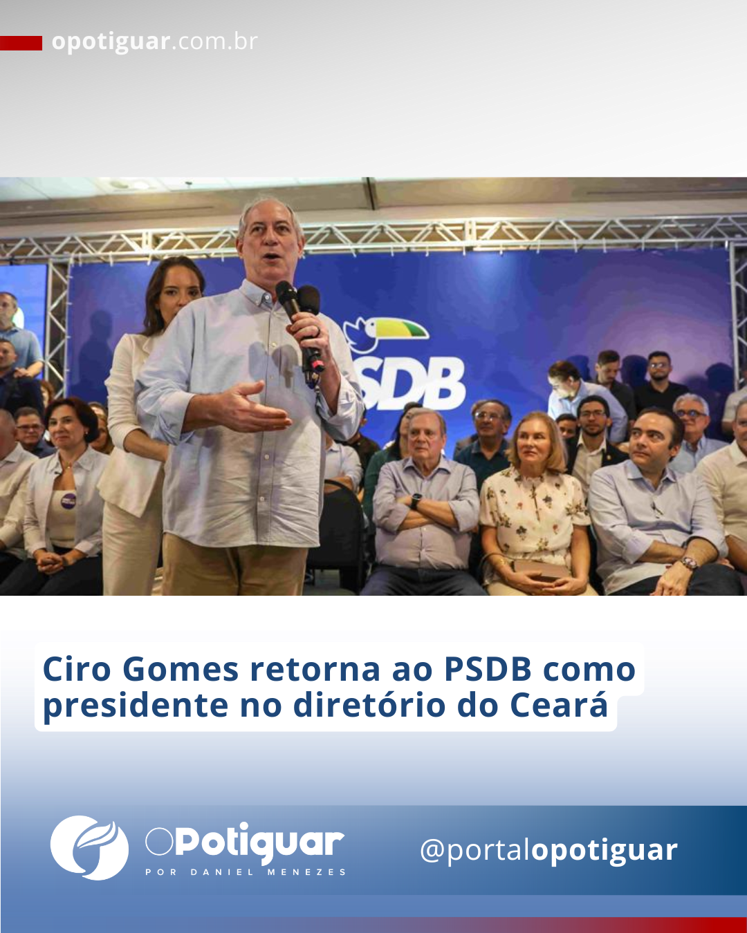 O anúncio foi feito pelo ex-senador Tasso Jereissati. Em seu discurso, afirmou que Ciro terá duas missões: em nível estadual, a de "reconstruir, aqui, no Estado do Ceará, aquela cultura de alegria, de entusiasmo, autoestima e orgulho de ser cearense"; e em âmbito nacional a de "ajudar a reconstruir um partido que mais do que nunca é necessário ao Brasil, um partido de centro".