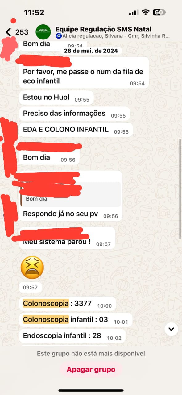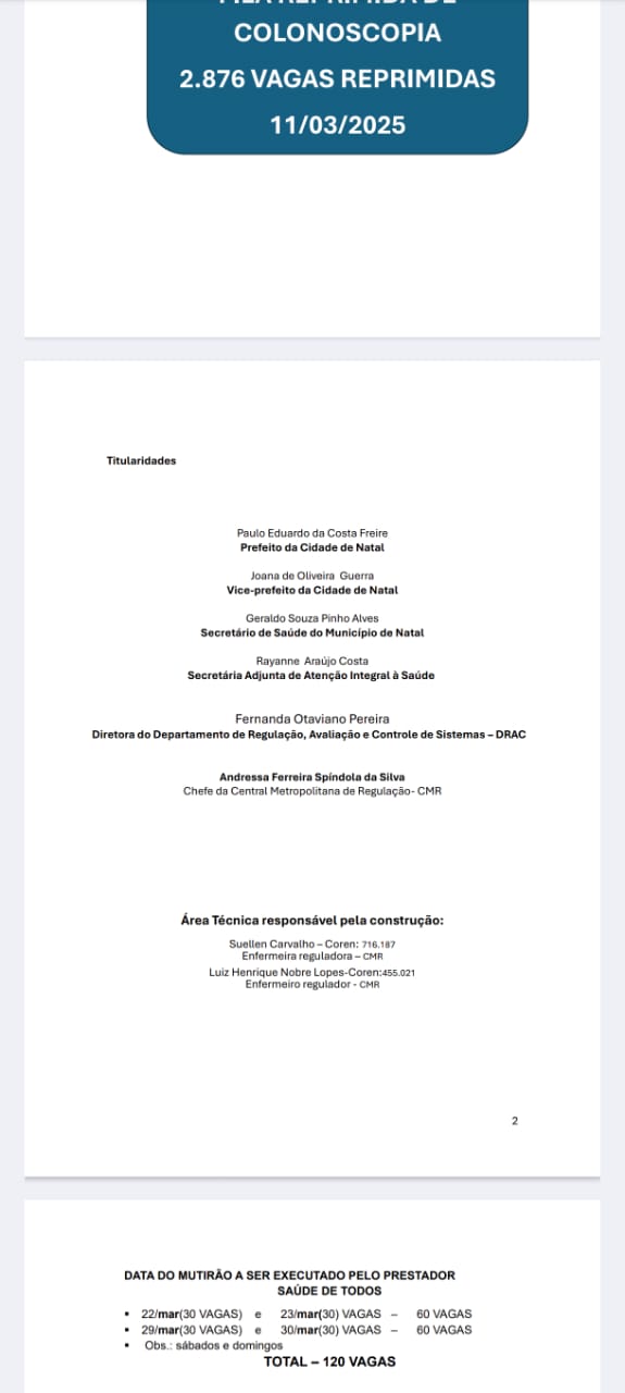 O Potiguar teve acesso ao controle de regulação do município da fila de colonoscopia. Em 11 de Março de 2025, existiam 2876 pessoas em condição de demanda reprimida e, naquele momento, o mutirão atendeu 120 pessoas.