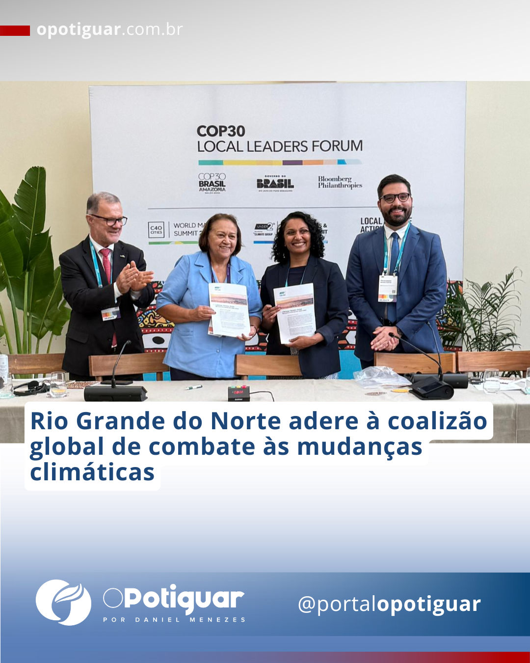 O Rio Grande do Norte oficializou, nesta segunda-feira (3), sua entrada na Under2 Coalition, aliança internacional de governos comprometidos em reduzir as emissões de gases de efeito estufa e alcançar a neutralidade de carbono até 2050. A adesão foi assinada pela governadora Fátima Bezerra durante o Fórum de Líderes Locais da COP30, realizado no Rio de Janeiro.