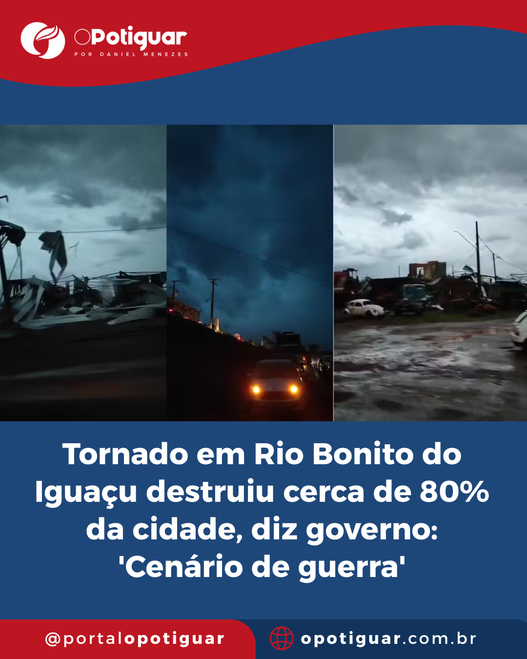 G1 - Cerca de 80% de Rio Bonito do Iguaçu, no Centro-Sul do Paraná, ficou destruída após a passagem de um tornado na tarde desta sexta-feira (7), segundo a Defesa Civil. O fenômeno deixou cinco mortos e mais de 130 feridos. Equipes que chegaram ao local relataram “cenário de guerra”, com casas destelhadas, imóveis danificados e postes no chão.
