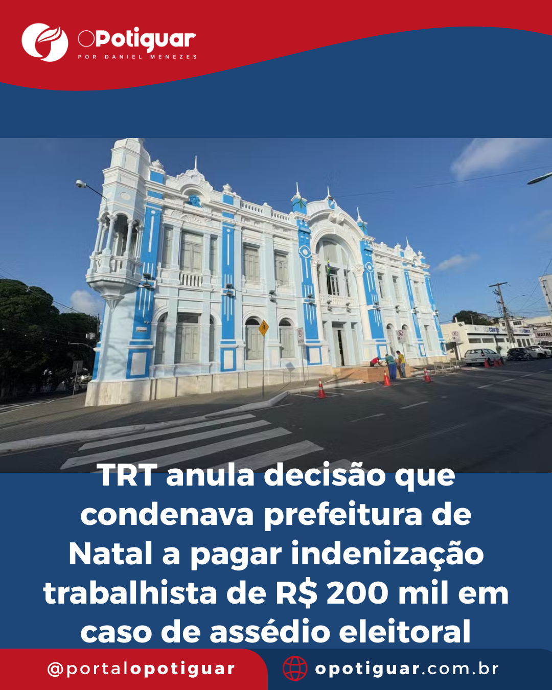 G1 RN - O Tribunal Regional do Trabalho da 21ª Região (TRT-RN) anulou, nesta sexta-feira (7), uma decisão de primeira instância que havia condenado a prefeitura de Natal ao pagamento de R$ 200 mil por assédio eleitoral coletivo que teria sido cometido contra servidores públicos durante as eleições municipais de 2024.