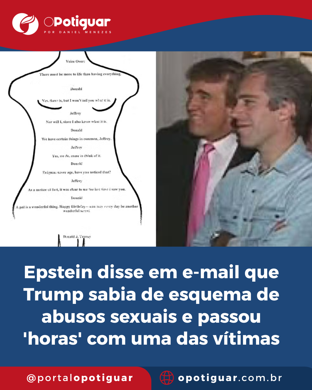 G1 - Jeffrey Epstein alegou que o presidente dos Estados Unidos, Donald Trump, "sabia" de suas condutas e que certa vez Trump "passou horas" em sua casa com uma vítima de abuso, segundo e-mails publicados pelo Congresso dos EUA nesta quarta-feira (12).