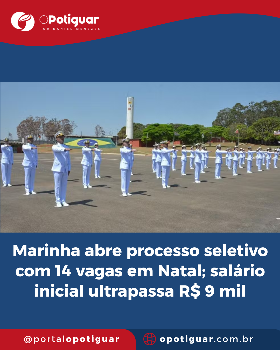 G1 RN - A Marinha do Brasil abriu um processo seletivo para oficiais temporários com oferta de 14 vagas para Natal. As oportunidades são para profissionais com ensino superior completo (veja, detalhado, mais abaixo). A remuneração bruta inicial ultrapassa os R$ 9 mil, segundo a agência de notícias oficial da Marinha.