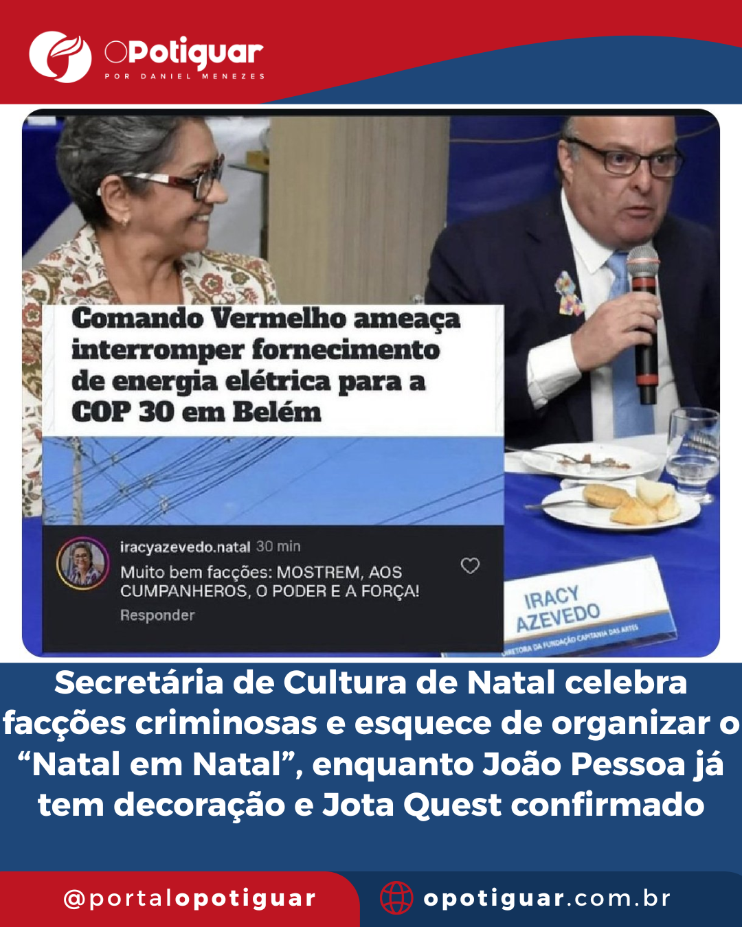 Em contraste, Natal segue sem qualquer decoração e sem divulgar sua programação oficial. A situação ganha ainda mais destaque diante da postura da secretária de Cultura e da Funcarte, Iracy Azevedo, que recentemente celebrou ações vinculadas a facções, enquanto a cidade continua sem o mínimo avanço na organização do “Natal em Natal”.