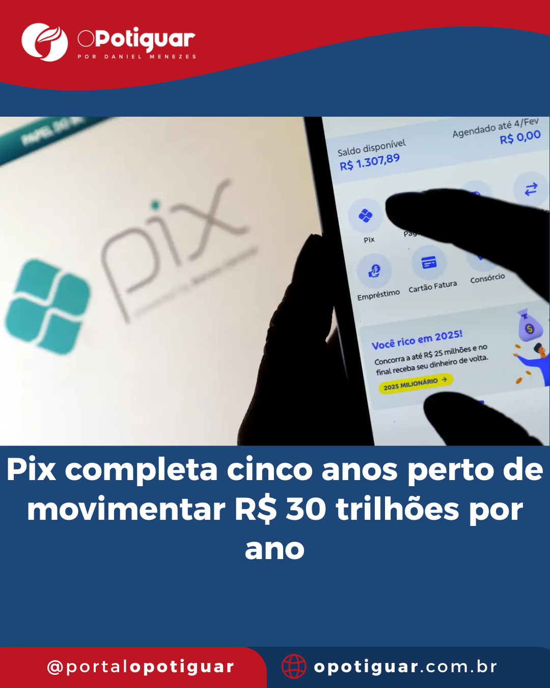 O Pix completa cinco anos neste domingo (16) como o principal método de pagamento do país. Lançado pelo Banco Central em novembro de 2020, o meio de pagamentos digital movimentou R$ 26,4 trilhões no ano passado. Isso equivale a quase duas vezes o produto interno bruto (PIB) do Brasil em 2024.
