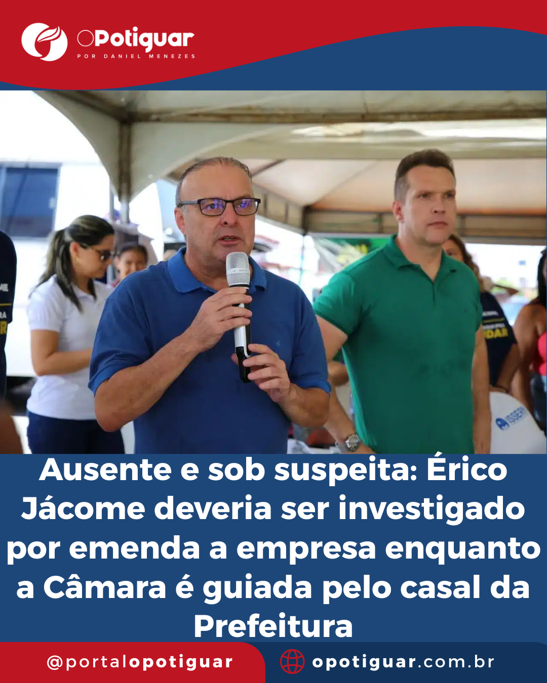Ausente e sob suspeita: Érico Jácome deveria ser investigado por emenda a empresa enquanto a Câmara é guiada pelo casal da Prefeitura