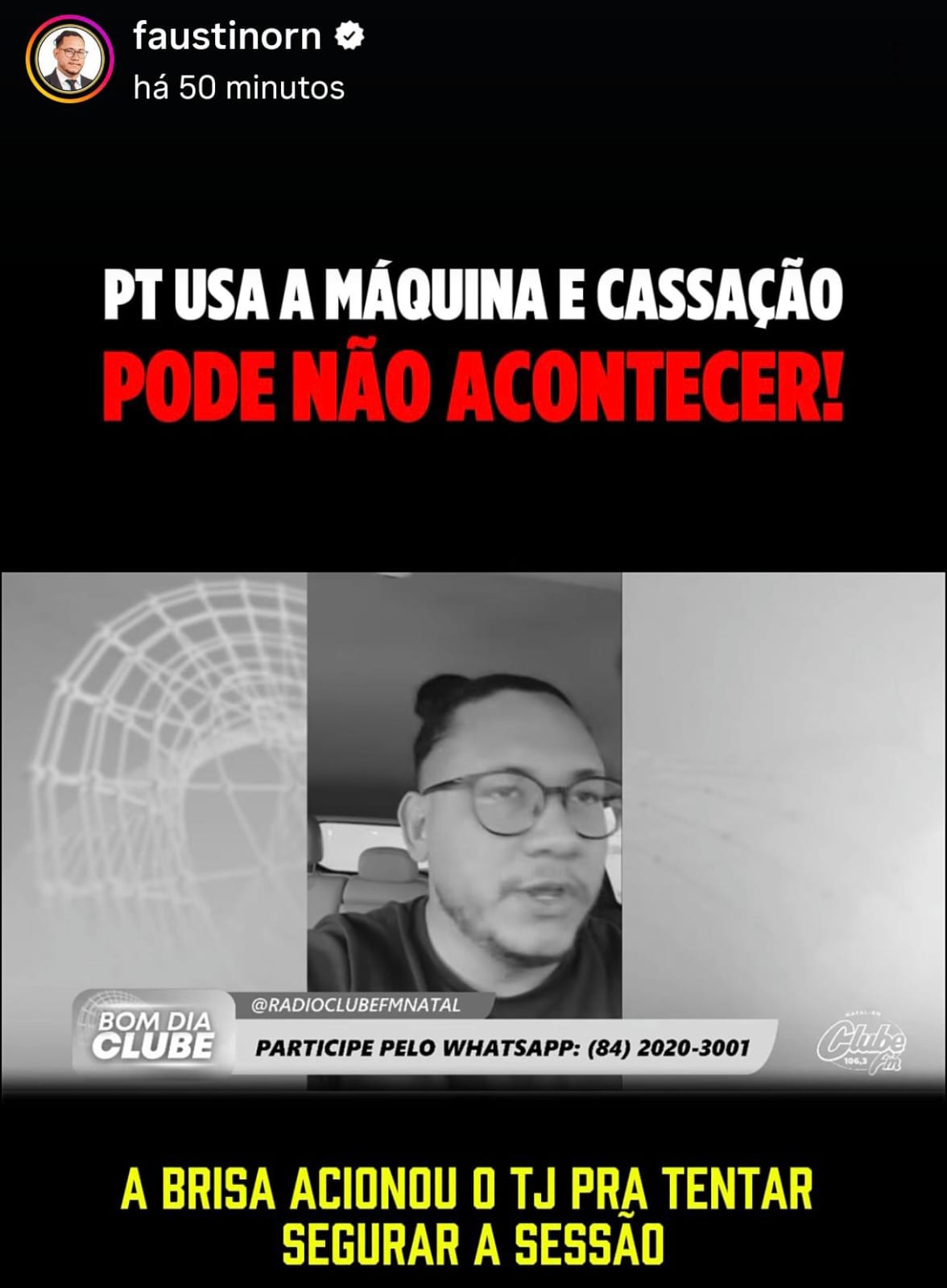 Após o magistrado Cornélio Alves suspender a sessão de hoje (18) na câmara que deliberaria sobre a cassação de Brisa por desrespeito aos prazos de convocação e defesa que Brisa tem direito por regimento, Matheus Faustino acusou o TJ-RN em suas redes de ficar à mercê da "máquina do PT", conforme veiculada na postagem.