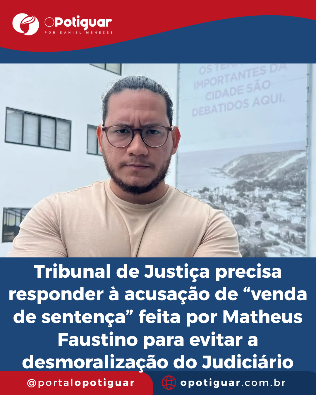 A acusação feita pelo vereador Matheus Faustino, durante entrevista à Rádio 96 no dia 18, não pode passar sem resposta. Ao afirmar publicamente que haveria “venda de sentença” no Tribunal de Justiça do Rio Grande do Norte, o parlamentar ultrapassou todos os limites do debate político e lançou uma suspeita gravíssima sobre a integridade do Judiciário potiguar. Não se trata de crítica institucional — trata-se de imputação direta de corrupção, feita ao vivo, sem apresentar qualquer indício que a sustente.