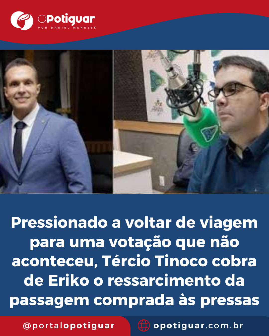 Pressionado a voltar de viagem para uma votação que não aconteceu, Tércio Tinoco cobra de Eriko o ressarcimento da passagem comprada às pressas
