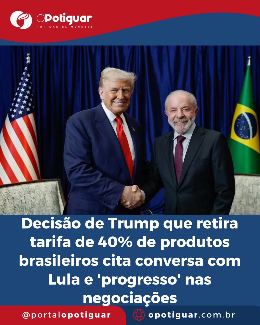 G1 - A decisão do presidente dos Estados Unidos, Donald Trump, que retirou tarifas de 40% de alguns produtos brasileiros nesta quinta-feira (20) menciona a conversa por telefone que Trump teve com o presidente Luiz Inácio Lula da Silva (PT) em outubro deste ano e afirma que houve um "progresso inicial nas negociações com o governo do Brasil".