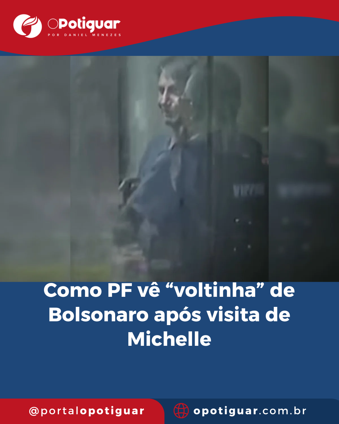 O registro exibe Bolsonaro com uma camisa escura, em uma das portas que dá acesso ao edifício onde cumpre detenção.