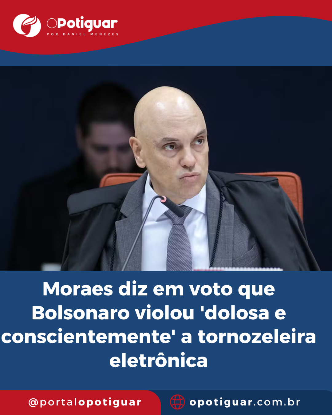 G1 - O ministro Alexandre de Moraes, do Supremo Tribunal Federal (STF), afirmou em seu voto nesta segunda-feira (24) que o ex-presidente Jair Bolsonaro violou "dolosa e conscientemente" a tornozeleira eletrônica.