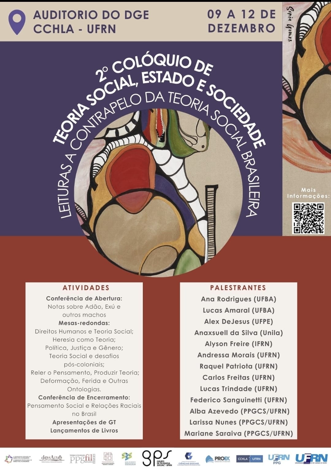 Sob organização da Linha de Pesquisa 3 "Teoria Social, Estado e Sociedade" do Programa de Pós-Graduação em Ciências Sociais da Universidade Federal do Rio Grande do Norte, e com a colaboração do Pororoca Social - Grupo de Pesquisa Interdisciplinar da UFRN, ocorrerá a segunda edição do Colóquio de Teoria Social, Estado e Sociedade nos dias 9, 10, 11 e 12 de dezembro de 2025, na Sala 518 do Auditório do Departamento de Geografia Prof. José Carlos Borges (Auditório do DGE) | CCHLA - UFRN. Contando com a participação de palestrantes de diversas instituições nacionais, como UFRN, UFPE, UFBA, IFRN e Unila, teremos nas manhãs e tardes do evento: conferências, mesas-redondas, apresentações de GT e lançamentos de livros voltados à "leitura a contrapelo" da teoria social brasileira. Para mais informações: https://www.instagram.com/coloquio.pororocasocial/.