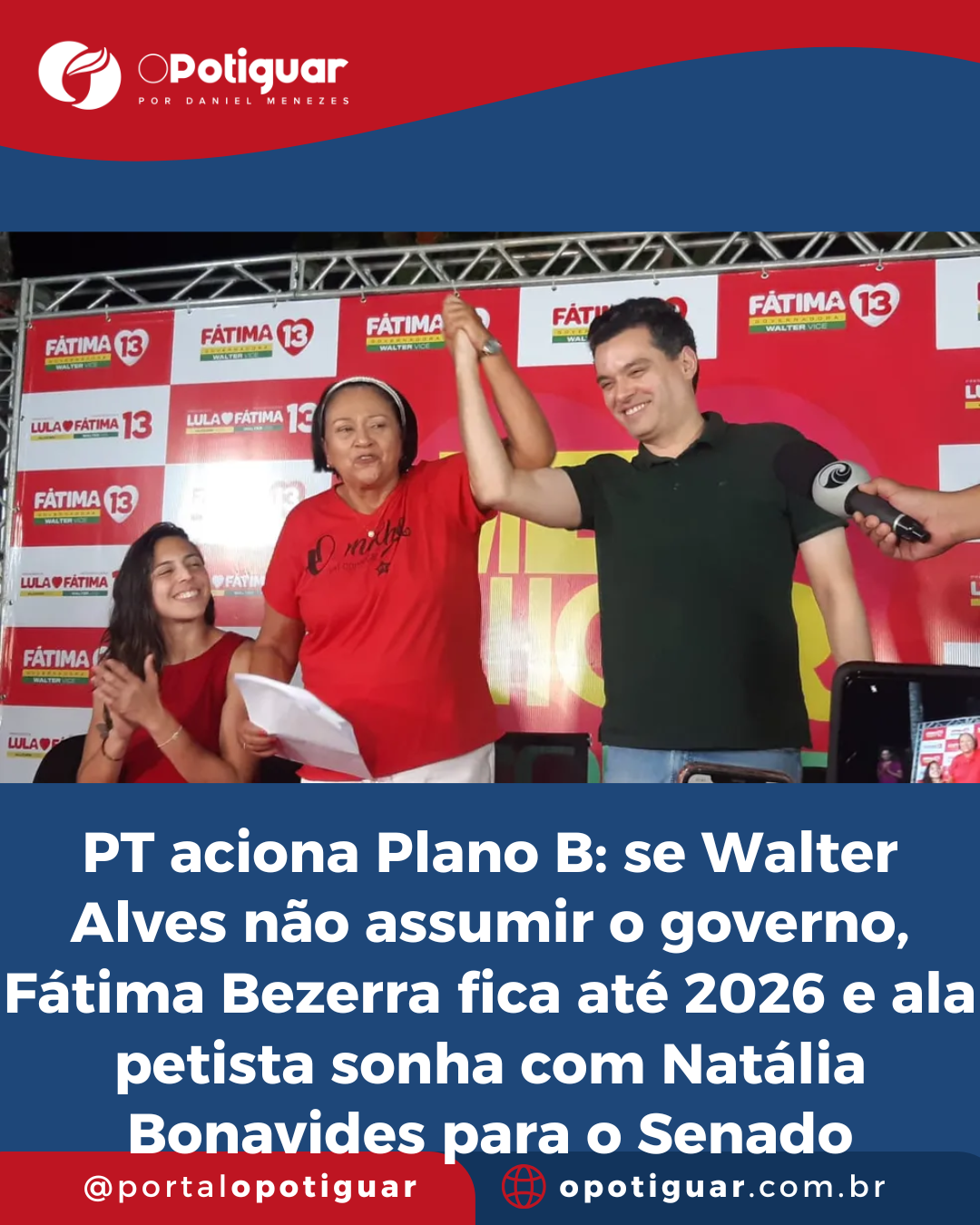 Setores do PT ligados à governadora Fátima Bezerra já trabalham com um Plano B para 2026 caso o vice-governador Walter Alves (MDB) decida não assumir o comando do Estado no próximo ano. Nesse cenário, Fátima permaneceria no cargo até o fim do mandato, reorganizando o tabuleiro sucessório e abrindo espaço para que o partido indique um nome competitivo para a eleição ao Senado. Entre os quadros cotados, a deputada federal Natália Bonavides desponta como preferência de setores do partido, que avaliam que sua votação expressiva em Natal em 2024 e sua capilaridade no campo progressista a colocam como nome natural para a disputa majoritária.