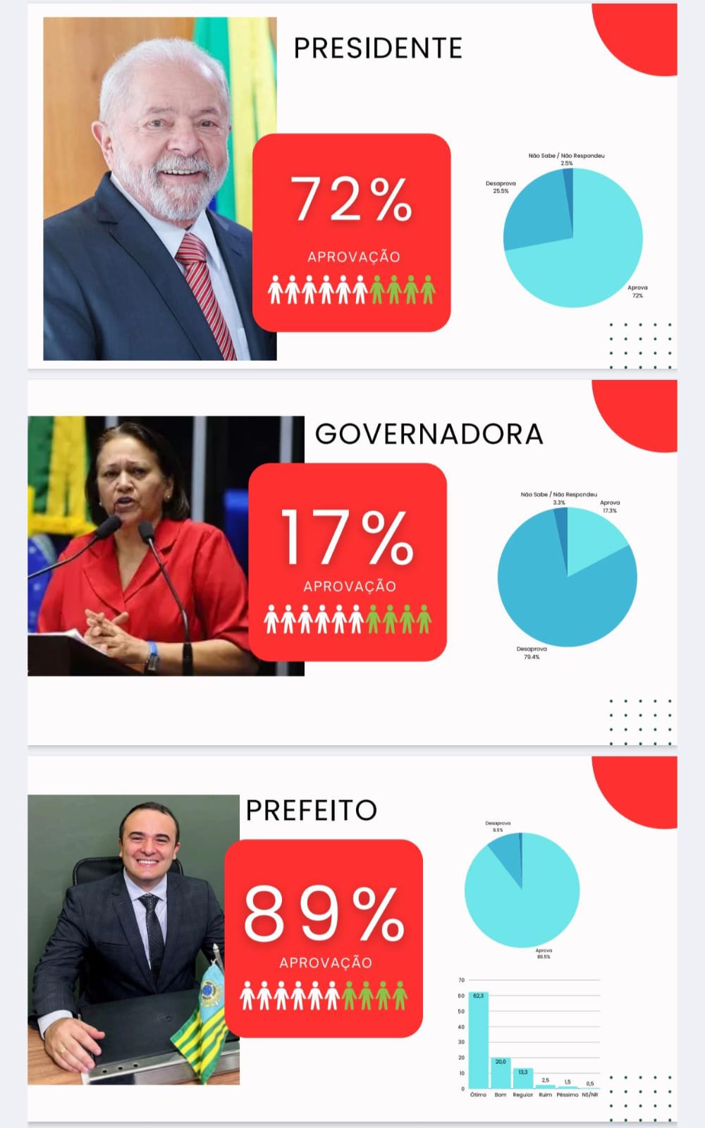 Pesquisa do Instituto Seta realizada nos dias 16 e 17 de dezembro, com 400 eleitores de Nova Cruz, aponta cenários bastante distintos na avaliação dos governos federal, estadual e municipal. O levantamento, que tem margem de erro de 4 pontos percentuais e intervalo de confiança de 95%, mostra aprovação expressiva do presidente Lula, que alcança 72% de avaliação positiva no município. A taxa de reprovação é minoritária, enquanto os que não souberam ou não responderam representam parcela residual do eleitorado.