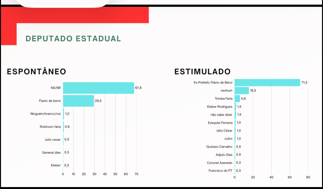 No cenário estimulado, quando os nomes dos pré-candidatos são apresentados, a liderança de Flávio de Beroí se consolida de forma ainda mais expressiva. Ele alcança 71,3% das intenções de voto, abrindo larga distância para o segundo colocado, Tomba Faria, que aparece com 5,8%. Nenhum candidato soma 15,5%, enquanto os demais nomes — como Kléber Rodrigues, Ezequiel Ferreira e Júlio César — registram índices próximos ou abaixo de 1%.
