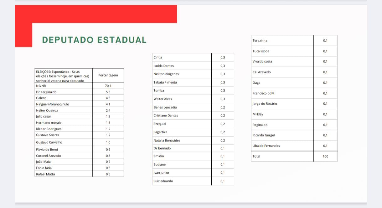 O levantamento também revela um elevado nível de indefinição: 70,1% dos entrevistados disseram não saber ou não responder, enquanto 4,1% afirmaram votar em ninguém, branco ou nulo. O dado indica que, apesar da liderança dos três primeiros, a disputa para a Assembleia Legislativa segue aberta, com amplo espaço para movimentações de campanha, consolidação de nomes e redefinição de preferências até o pleito.
