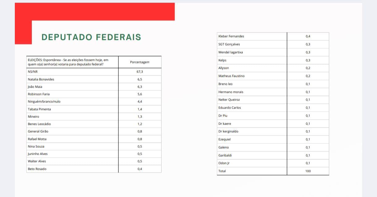 Na segunda posição, surge João Maia, com 6,3%, tecnicamente empatado com a líder dentro da margem de erro. Em terceiro lugar, aparece Robinson Faria, com 5,6%, completando o grupo dos três parlamentares mais citados na lembrança espontânea do eleitorado potiguar.