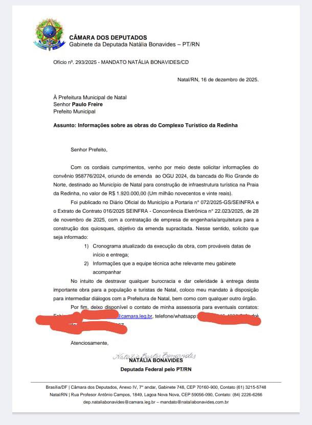 . Já no Ofício nº 293/2025, datado de 16 de dezembro, a deputada voltou a procurar o prefeito, solicitando cronograma atualizado das obras e reiterando que seu mandato estava disponível para “destravar qualquer burocracia” e dar celeridade à entrega da intervenção na Redinha.