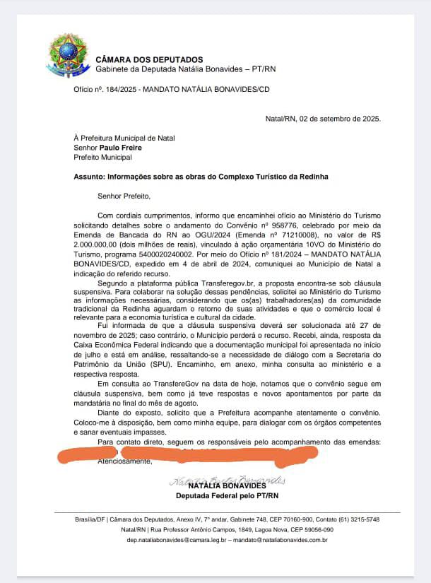 Ao contrário do que afirmou o prefeito Paulinho Freire em entrevista recente ao Agora RN, ao dizer que parlamentares “não destravam um centavo” para Natal, documentos oficiais revelam que a deputada federal Natália Bonavides buscou colaborar diretamente com a Prefeitura do Natal em ao menos duas oportunidades formais em 2025 — e não obteve retorno. Em setembro e dezembro de 2025, a parlamentar encaminhou ofícios ao prefeito tratando especificamente do Complexo Turístico da Redinha, obra financiada com recursos federais oriundos de emendas ao Orçamento Geral da União, alertando para entraves burocráticos e colocando seu mandato à disposição para ajudar a destravar essas e outras pendências.