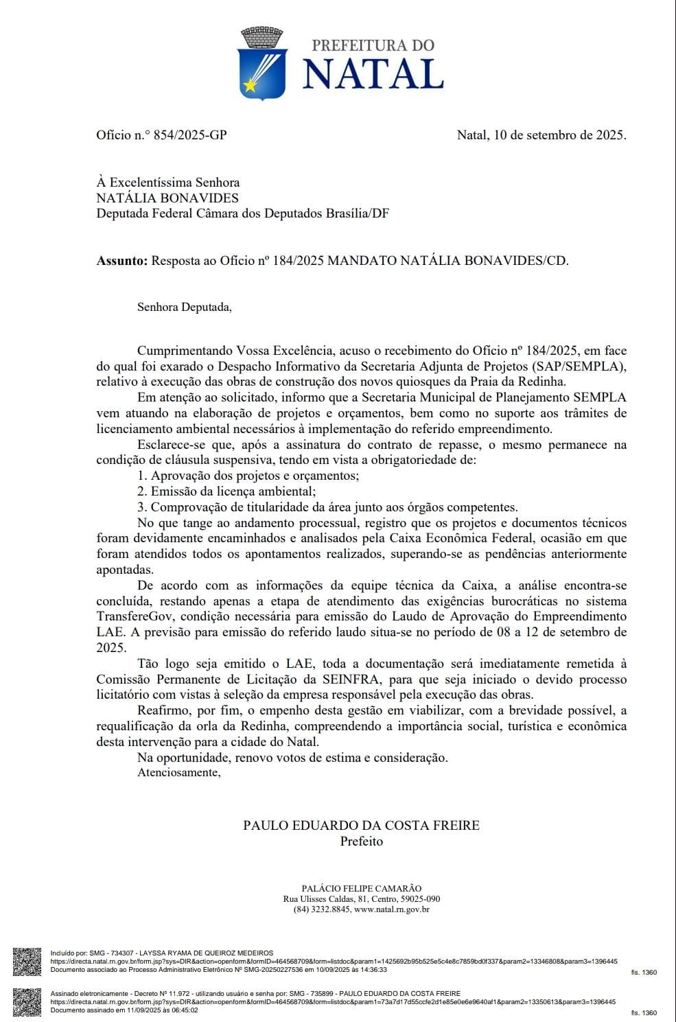 A Prefeitura do Natal respondeu ao ofício nº 184/2025 encaminhado em setembro pela deputada federal Natália Bonavides, no qual o mandato se colocava à disposição para colaborar com a viabilização de recursos e destravar etapas burocráticas das obras dos quiosques da Praia da Redinha. A resposta oficial, assinada pelo prefeito Paulo Eduardo da Costa Freire e datada de 10 de setembro, confirma o recebimento do pedido e detalha o andamento técnico junto à Caixa Econômica Federal, licenças ambientais e etapas no sistema TransfereGov, indicando que o processo dependia apenas do Laudo de Aprovação do Empreendimento (LAE) para avançar à licitação.