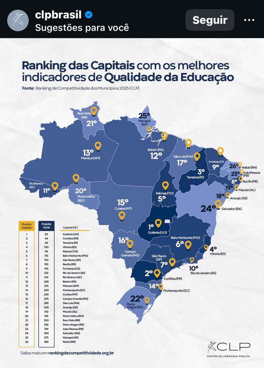 Natal aparece na última colocação entre as capitais brasileiras em qualidade da educação, segundo o Ranking de Competitividade dos Municípios 2025, elaborado pelo Centro de Liderança Pública (CLP). A capital potiguar ficou na 26ª posição, desempenho que expõe fragilidades estruturais e de gestão no sistema educacional municipal e estadual.