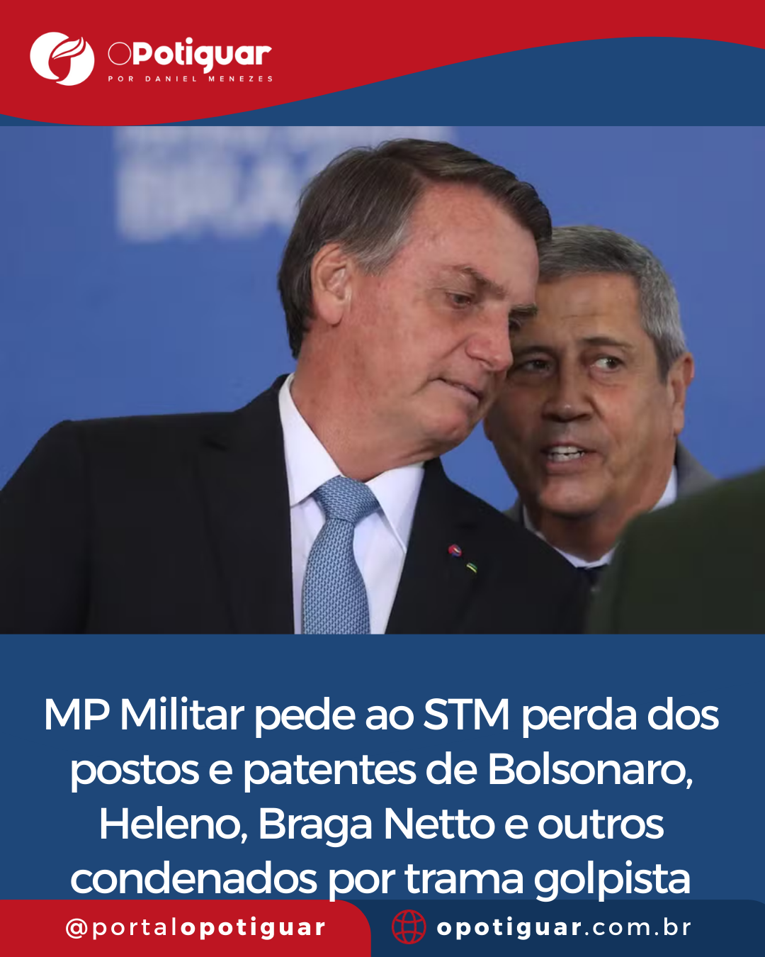 G1 - O Ministério Público Militar pediu nesta terça-feira (3) ao Superior Tribunal Militar (STM) que declare a perda dos postos e das patentes do ex-presidente Jair Bolsonaro, do ex-comandante da Marinha Almir Garnier e dos generais Augusto Heleno, Paulo Sérgio Nogueira e Walter Souza Braga Netto.
