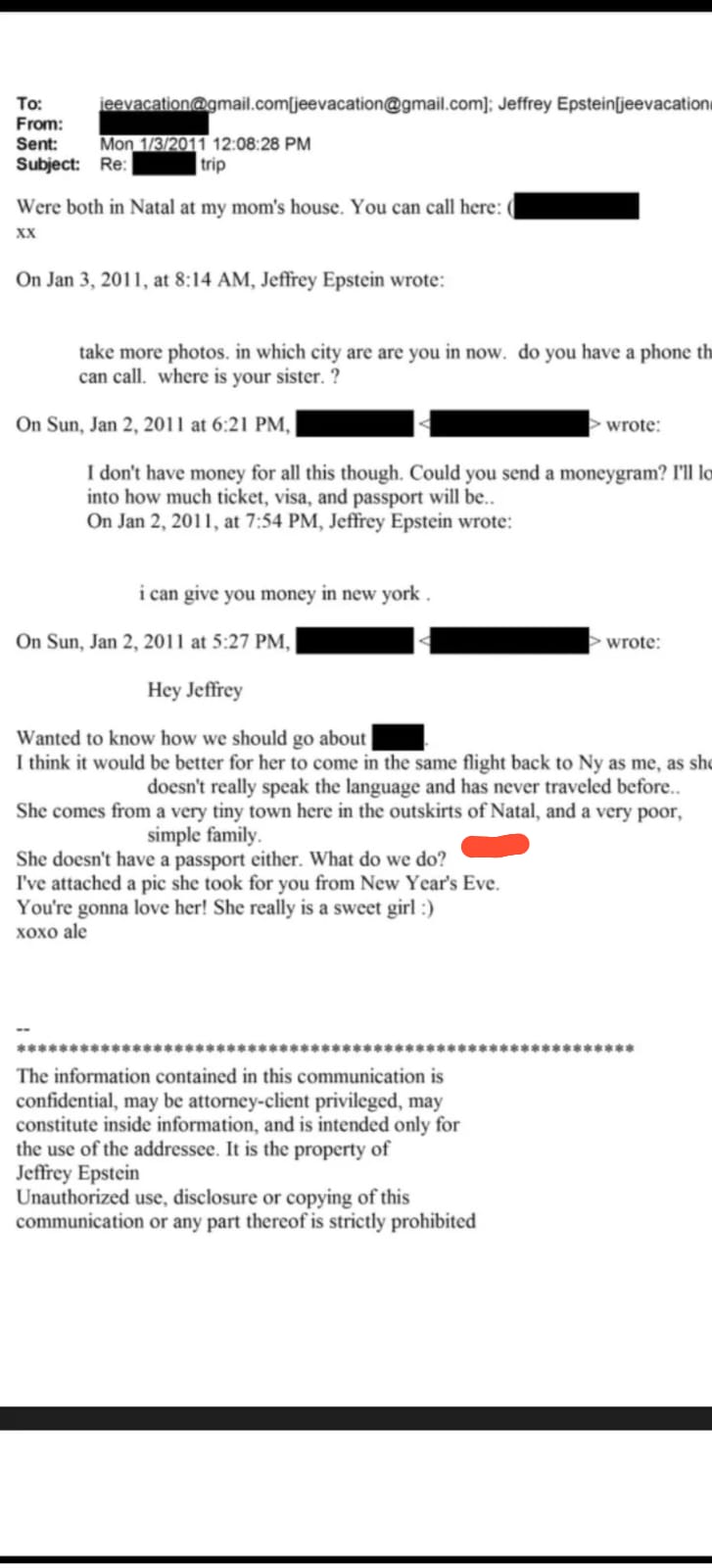 Nos e-mails consta o nome Alexia como a pessoa que mantém contato direto e recorrente com Epstein. Nas mesmas trocas aparece Jamilly, identificada como a jovem mencionada nos trechos relacionados ao Brasil-Natal/RN. As mensagens indicam que Alexia e Jamilly estavam em Natal, que Jamilly mora nos arredores da cidade, vem de família muito simples, não fala outro idioma, nunca viajou e não possuía passaporte à época. Em diferentes trechos, Alexia pede orientações sobre viagem, valores, documentos e logística para levar Jamilly ao exterior; há também pedidos de mais fotos e informações, com a conversa tratando diretamente da organização da ida da jovem.