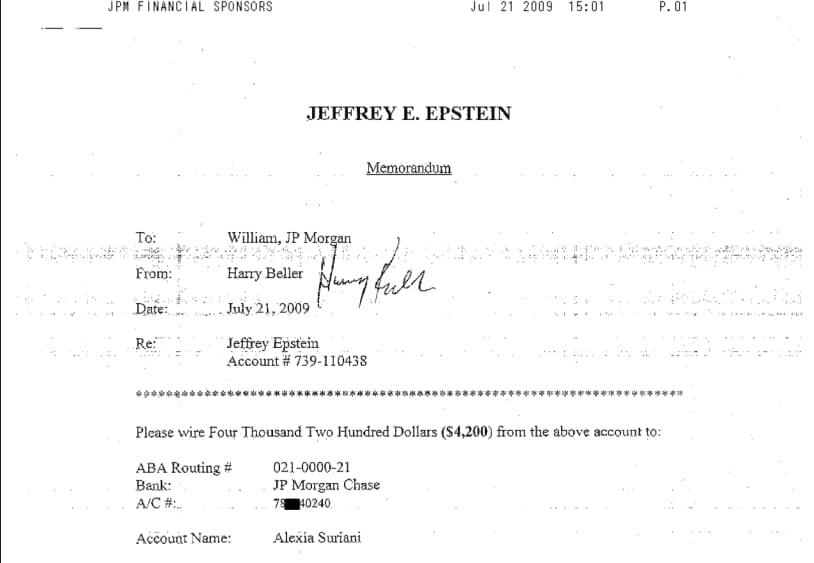 Registros financeiros também mostram transferência de US$ 4.200 a partir de conta vinculada a Epstein para conta em nome de Alexia Suriani, conforme memorando bancário de julho de 2009. O documento indica a operação, sem detalhar a finalidade do pagamento.