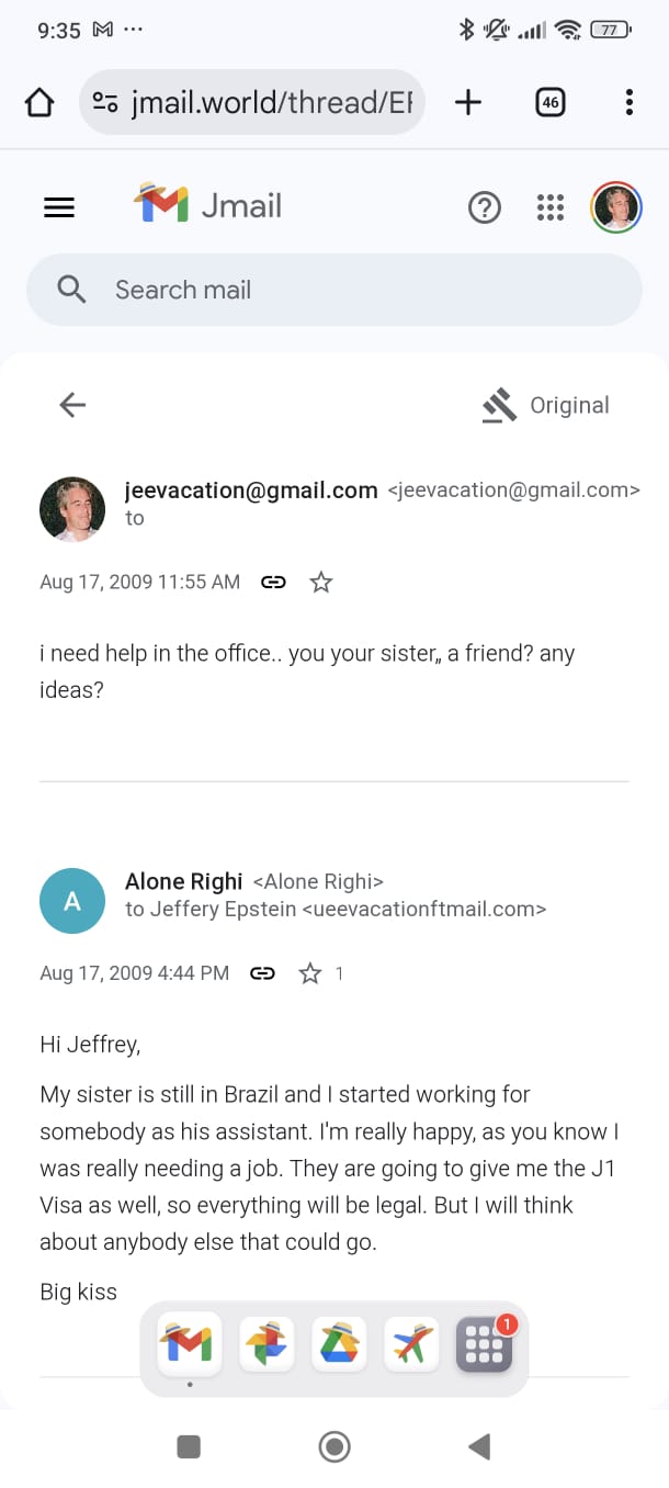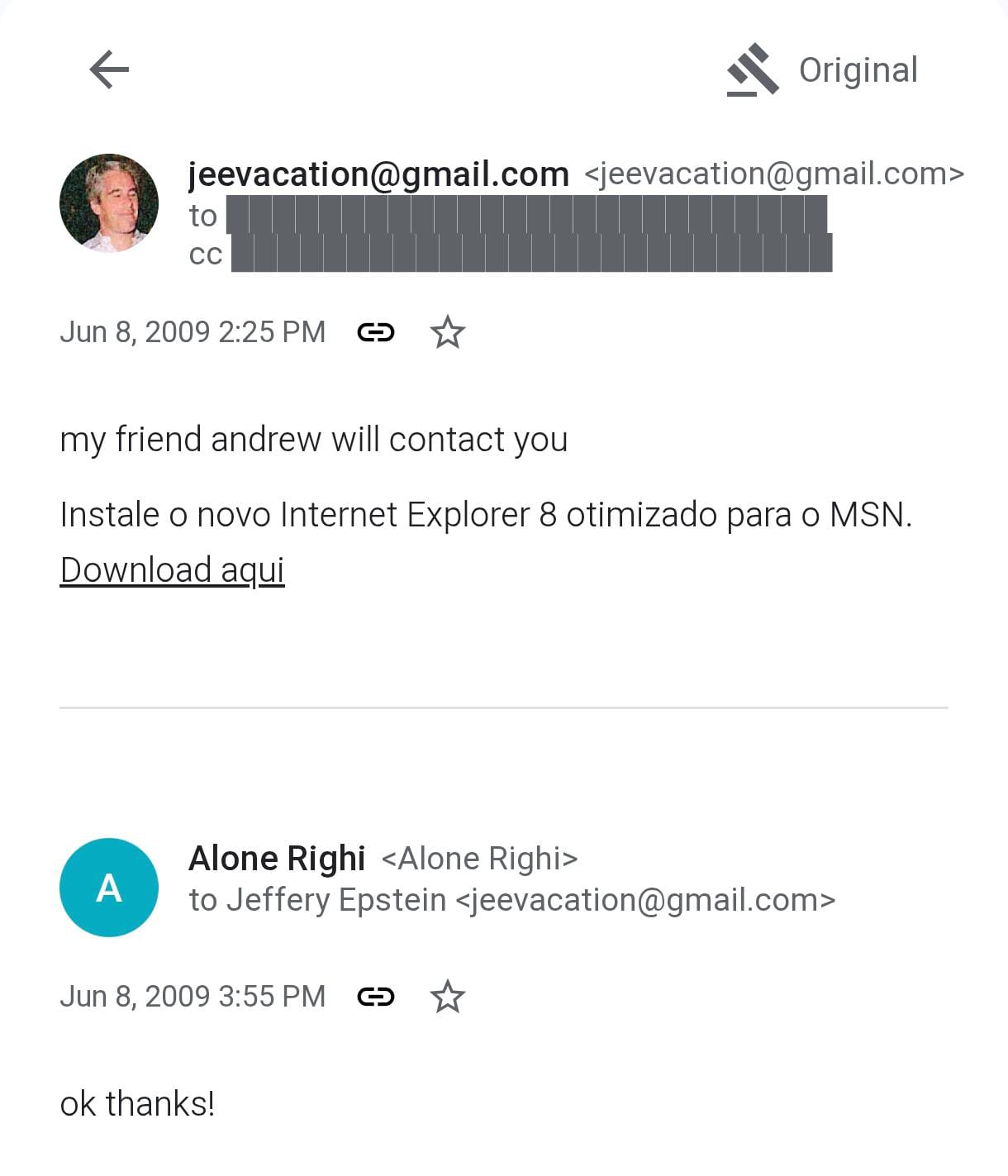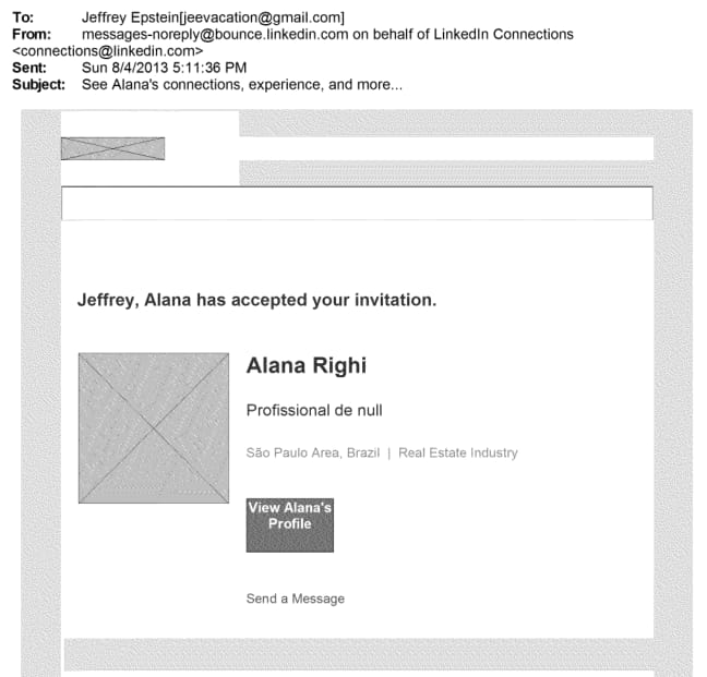 Em troca de mensagens datadas de 2009, uma interlocutora identificada como Alone (ou Alana) Righi informa a Epstein que “minha irmã ainda está no Brasil”, ao responder a um pedido em que o financista questiona se ela poderia indicar “você, sua irmã, uma amiga”. Em outro trecho, a mesma interlocutora relata que iniciou trabalho como assistente de um terceiro, mencionando a obtenção de visto, e se dispõe a “pensar em outras pessoas” que poderiam ir. As mensagens, reproduzidas em documentos judiciais, não descrevem atividades específicas, limitando-se a registrar a oferta de contatos, possivelmente código para outros tipos de serviços.
