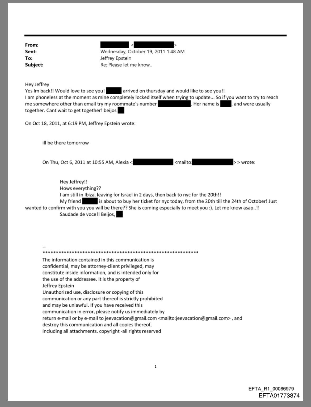 Outras comunicações apontam que Alexia apresentou contatos e intermediou aproximações entre Epstein e terceiros, inclusive referência a um “Andrew”, que é mencionado em outras comunicações como o príncipe Andrew. Em mensagens posteriores, Epstein também menciona a necessidade de que "Alexia fosse até seu escritório" prestar um serviço, sem especificar o objeto do encontro.