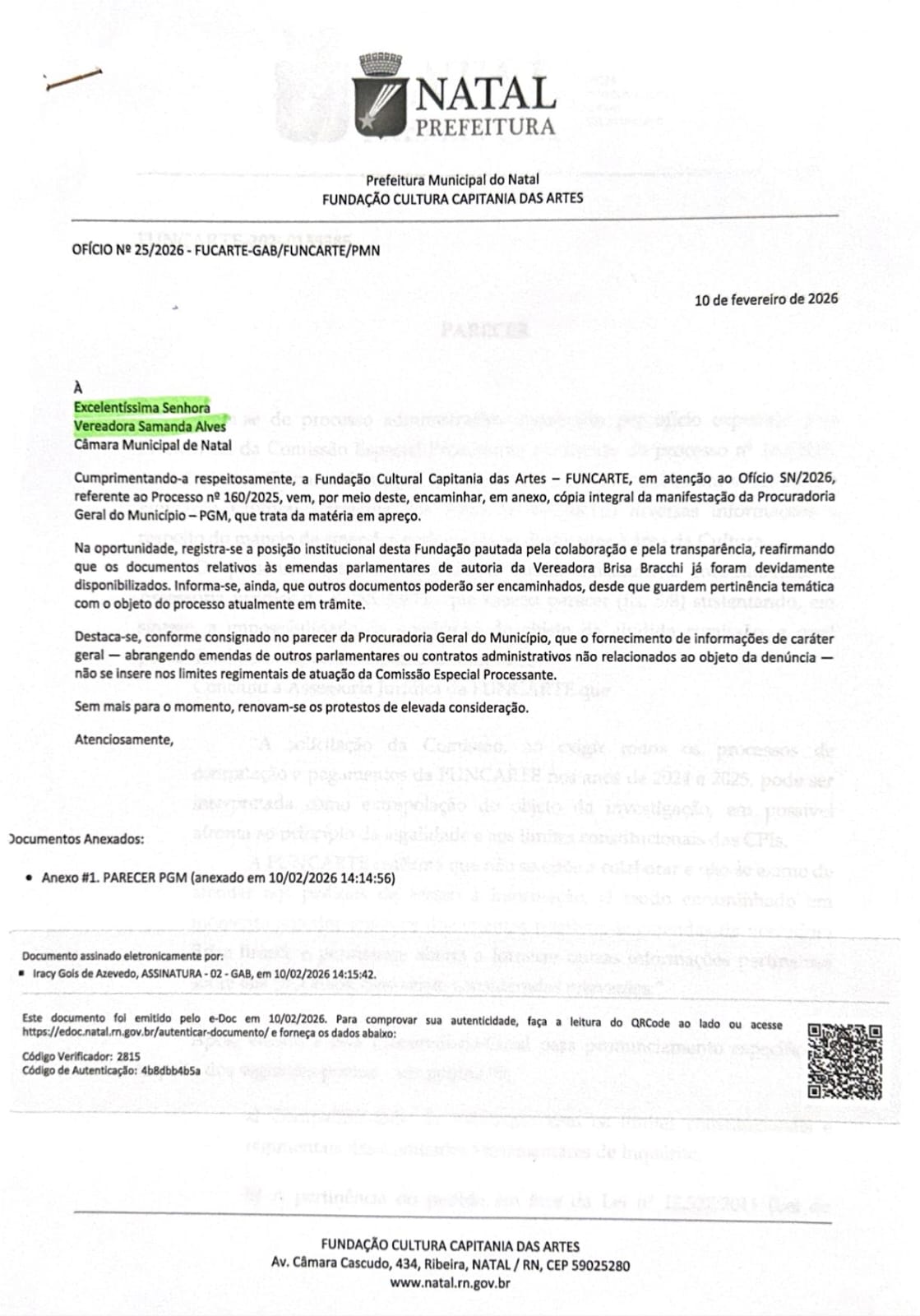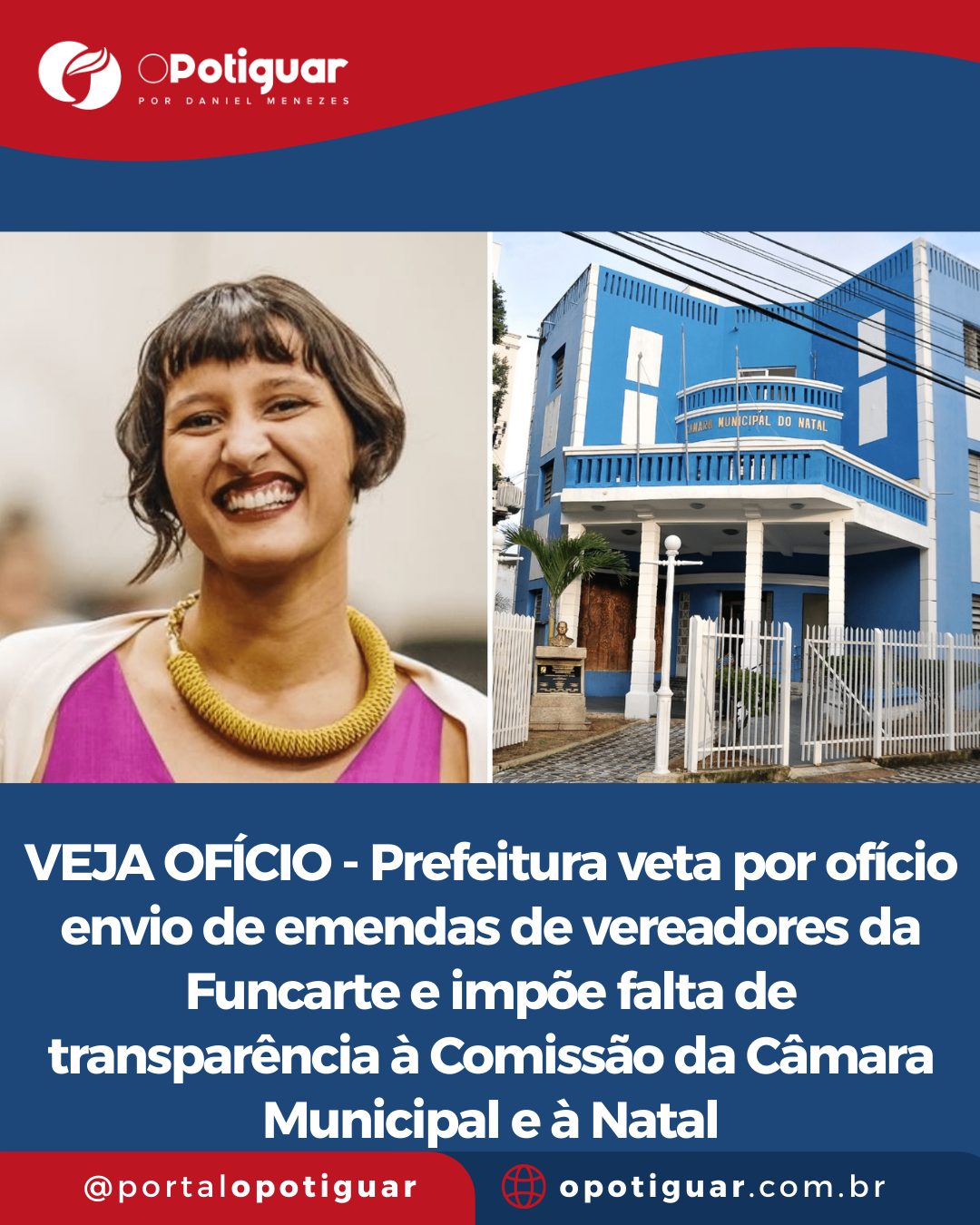VEJA OFÍCIO - Prefeitura veta por ofício envio de emendas de vereadores da Funcarte e impõe falta de transparência à Comissão da Câmara Municipal e à Natal