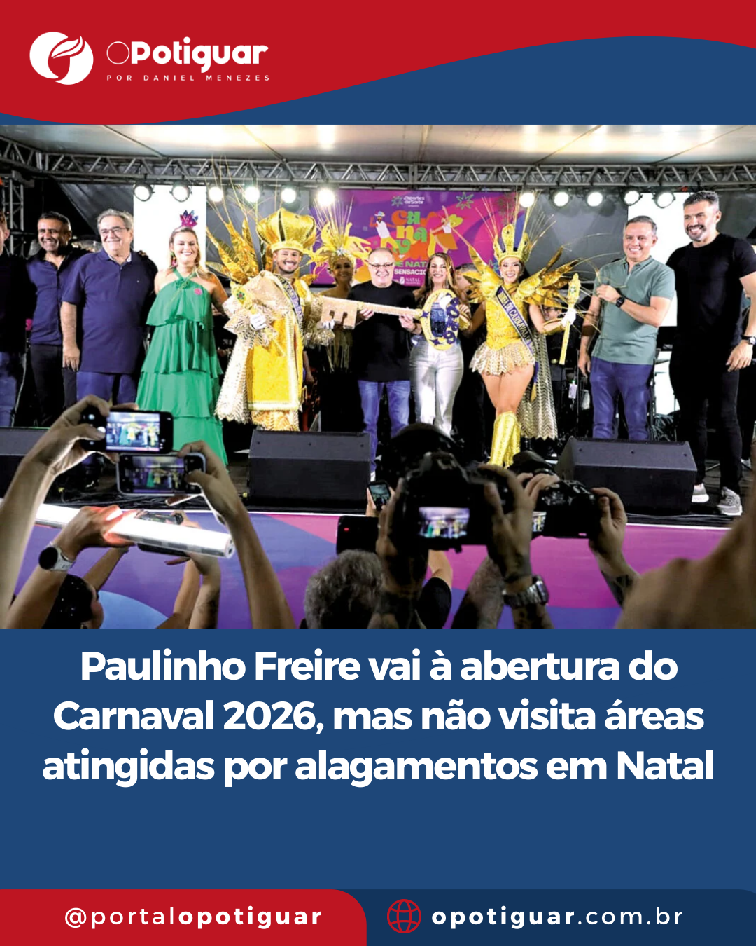 Enquanto entregava simbolicamente a chave da cidade ao Rei Momo e à Rainha do Carnaval 2026, em cerimônia realizada no Largo do Atheneu, o prefeito Paulinho Freire marcou presença no evento que deu início oficial à folia em Natal. A programação festiva foi anunciada com destaque, reforçando o calendário de shows e blocos espalhados por diversos polos da capital.