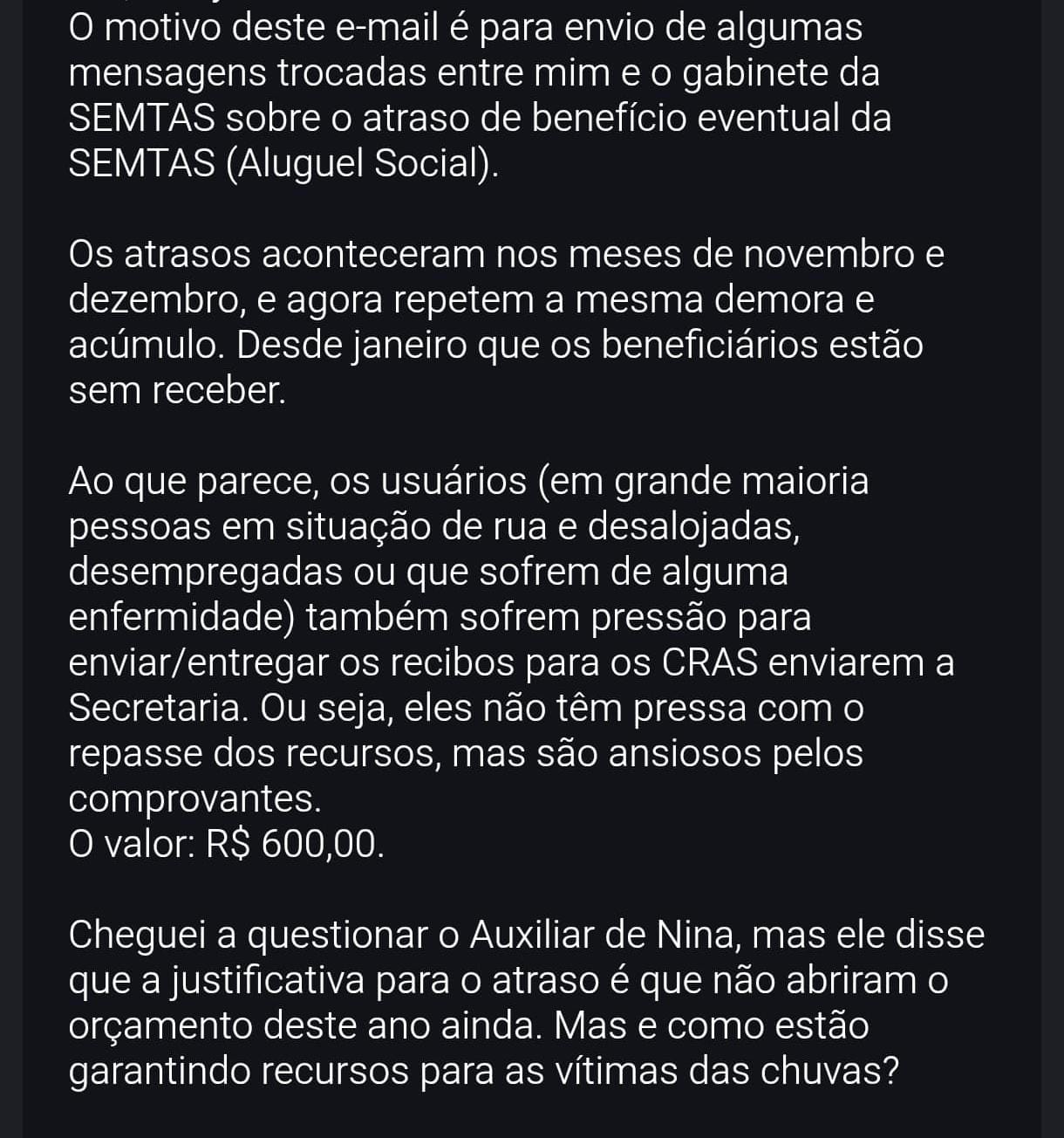 Segundo o relato, beneficiários estariam sendo cobrados a apresentar comprovantes e recibos aos CRAS para encaminhamento à Secretaria, enquanto aguardam a regularização dos pagamentos. A justificativa informal apresentada, conforme a denúncia, seria a não abertura do orçamento anual. Diante do cenário, há preocupação com possíveis despejos e agravamento da situação social das famílias atingidas. O blog deixa o espaço aberto para manifestação da SEMTAS sobre os apontamentos relatados.
