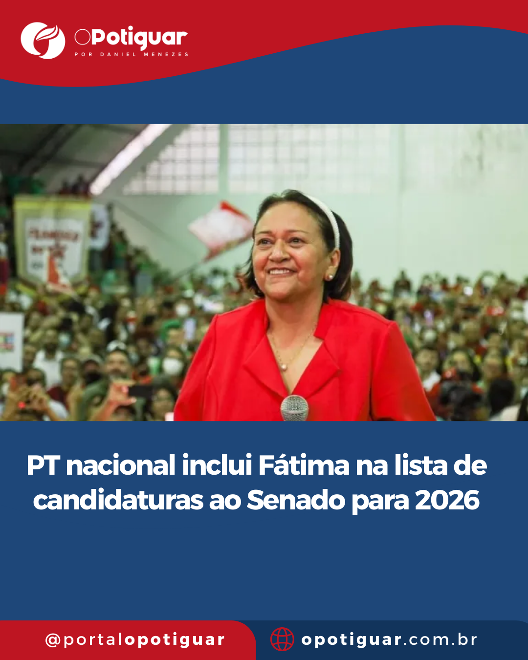O Partido dos Trabalhadores definiu uma lista nacional com candidaturas consideradas prioritárias para o Senado nas eleições de 2026, e entre os nomes confirmados está o da governadora do Rio Grande do Norte, Fátima Bezerra. A inclusão da gestora potiguar no planejamento nacional da legenda reforça que o partido mantém o projeto de lançá-la para disputar uma das duas vagas que estarão em jogo no estado no próximo pleito.
