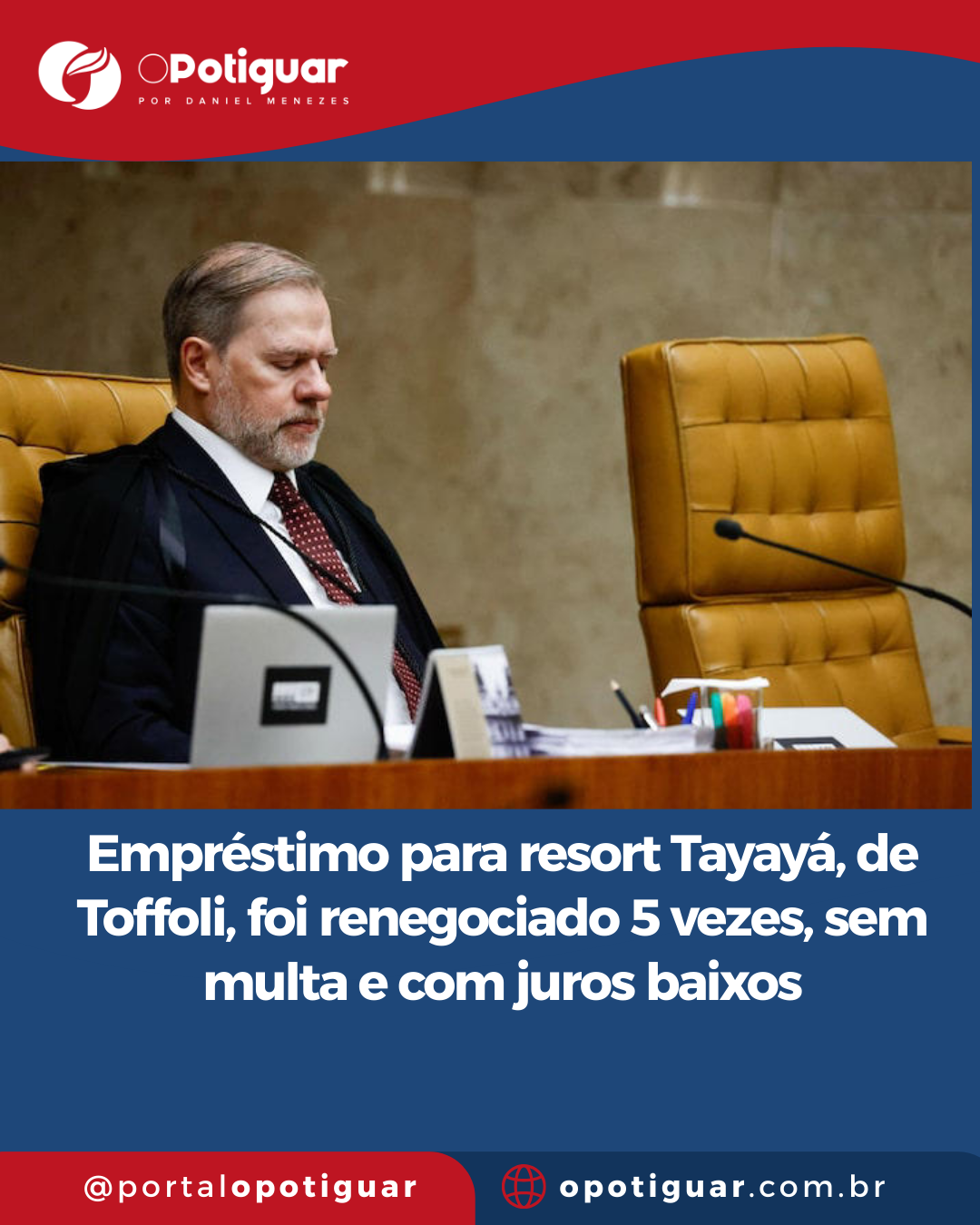 A última renegociação ocorreu em outubro de 2024, quando Toffoli ainda era sócio do Tayayá. Na ocasião, ficou registrado em cartório que o “saldo devedor de R$ 7.175.831,30, com novo vencimento em 15/07/2026, ou seja, 21 meses, com isenção da impontualidade, sendo acrescidos ao referido valor juros prefixados de 6,5% ao ano”.