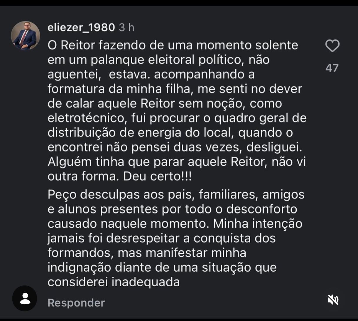 A interrupção de energia durante o discurso do reitor do IFRN Zona Norte ganhou contornos ainda mais graves após um bolsonarista assumir publicamente, nas redes sociais, a autoria da ação. No comentário, o próprio responsável relata ter desligado o fornecimento elétrico como forma de reagir à fala institucional, além de incentivar o ambiente de vaias no local. A admissão explícita transforma o episódio de tumulto em um caso que evidencia a disposição de ultrapassar limites institucionais para impor posições políticas.