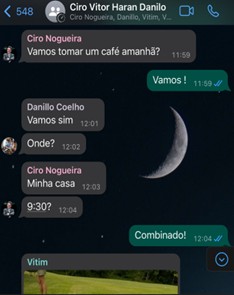 O quarteto continuou conversando nas semanas seguintes, segundo os prints obtidos pela polícia. No dia 4 de janeiro, Ciro escreveu no grupo: “Querem passar aqui no hotel pra gente atualizar as coisas?”. Haran respondeu: “Ok, estamos indo.” Dali a pouco, Vitinho disse: “Estamos aqui.” Ciro pediu então “5 min”. A conversa dá a entender que os três se encontraram naquela tarde.