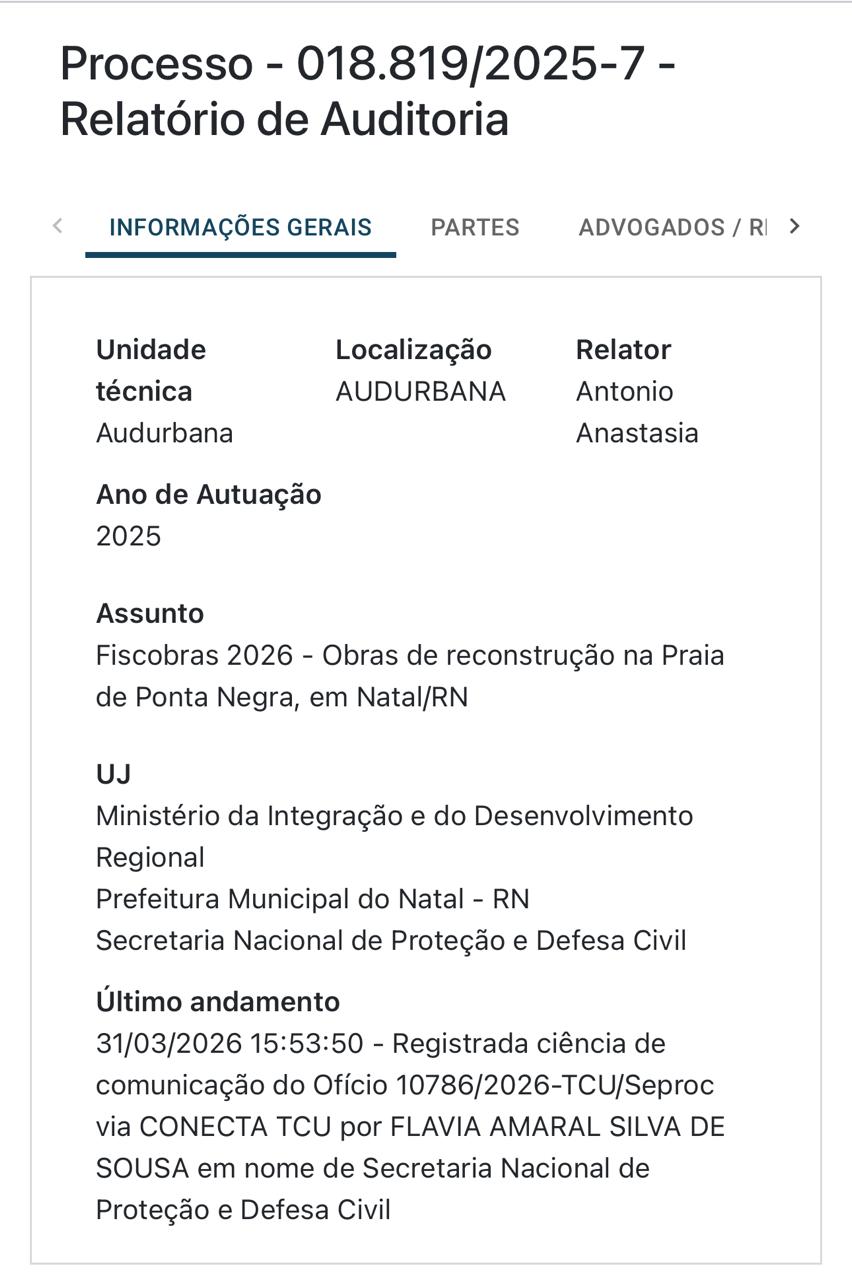 O Tribunal de Contas da União abriu processo de auditoria (018.819/2025-7) para apurar as obras na praia de Ponta Negra, em Natal. A investigação está vinculada ao programa Fiscobras 2026 e envolve a atuação da Prefeitura Municipal de Natal, do Ministério da Integração e do Desenvolvimento Regional e da Secretaria Nacional de Proteção e Defesa Civil, indicando que o caso já mobiliza diferentes níveis da administração pública.