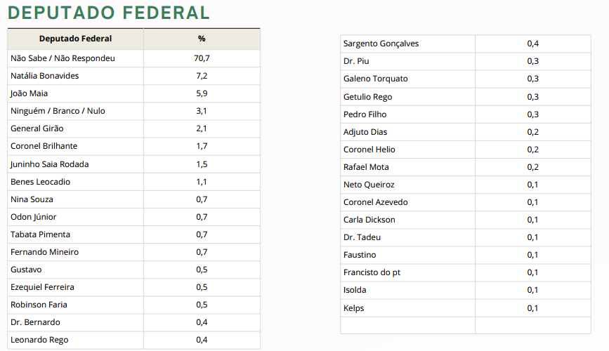 INSTITUTO SETA - DEPUTADO FEDERAL - Natália Bonavides lidera intenções de voto para deputada federal; João Maia aparece em seguida; veja todos os nomes