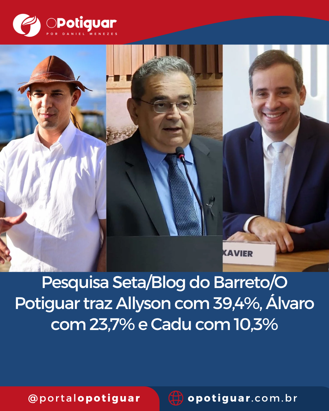 Pesquisa Seta/Blog do Barreto/O Potiguar traz Allyson com 39,4%, Álvaro com 23,7% e Cadu com 10,3%
