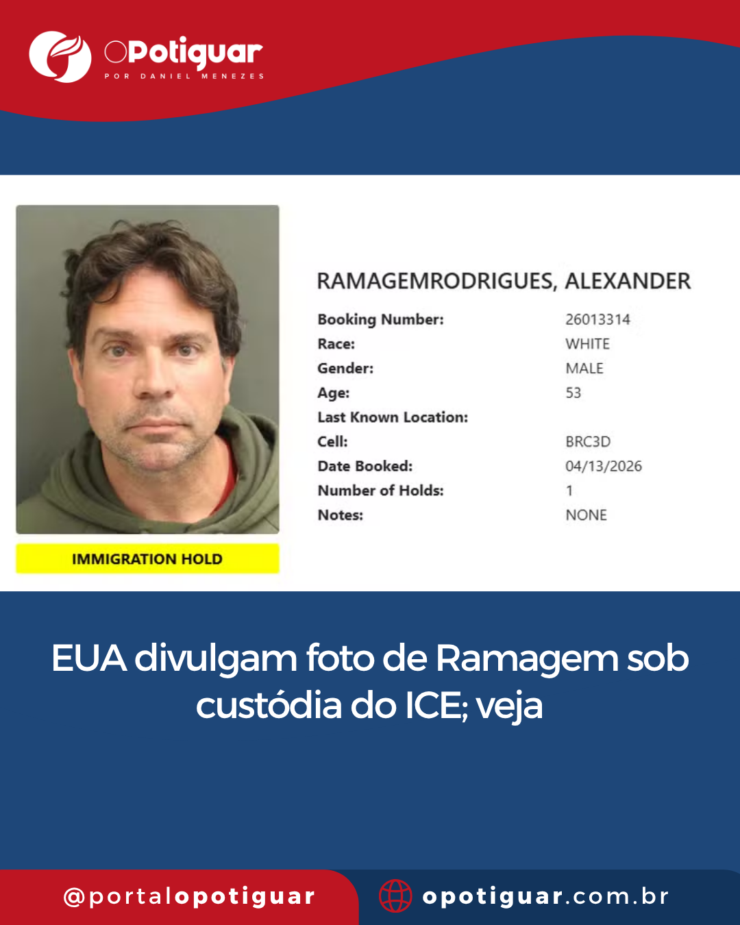 G1 - O governo dos Estados Unidos divulgou uma imagem do ex-deputado federal Alexandre Ramagem após ser preso por agentes do Serviço de Imigração e Controle de Aduanas (ICE) nesta segunda-feira (13).