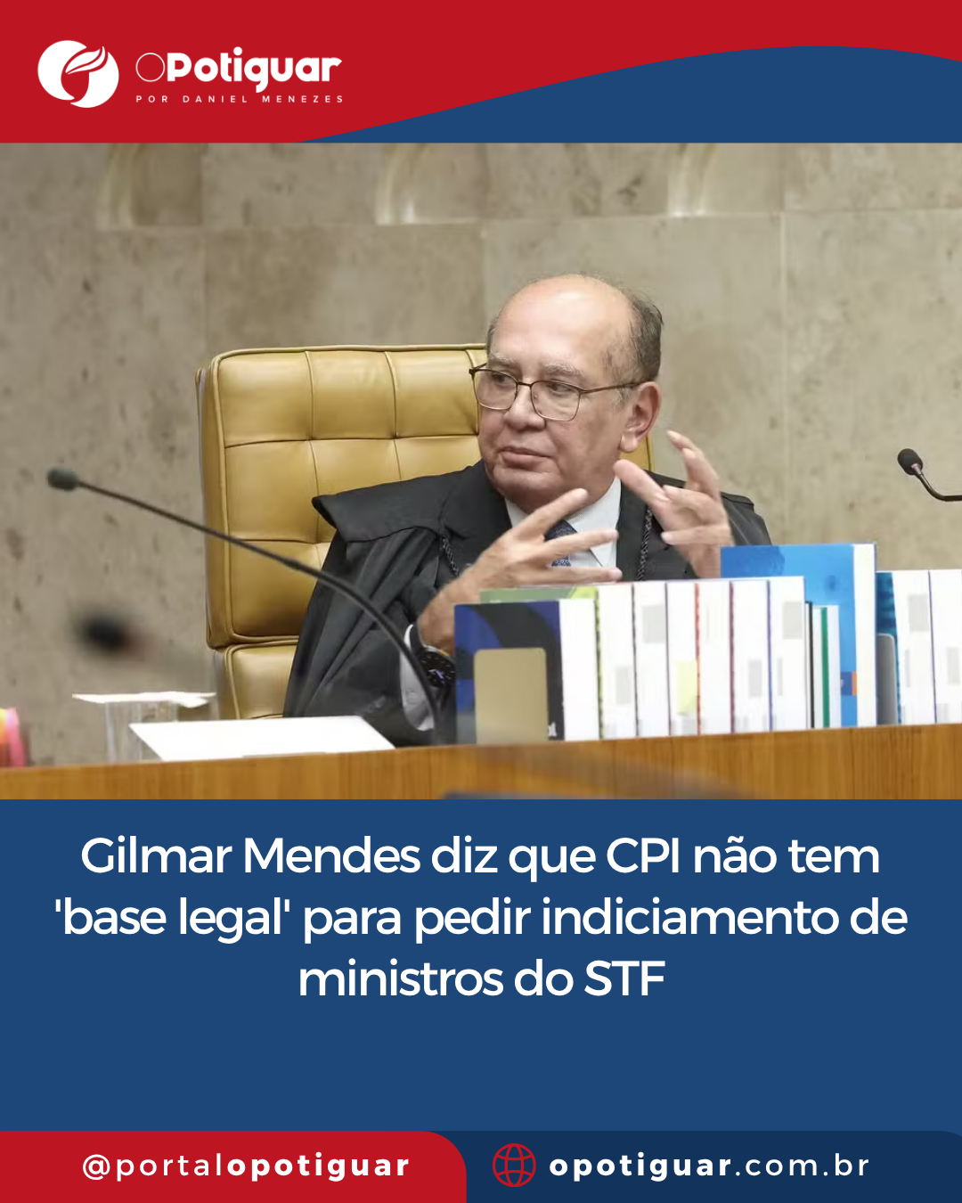 G1 - O ministro Gilmar Mendes, do Supremo Tribunal Federal (STF), afirmou nesta terça-feira (14) que o pedido do relator da Comissão Parlamentar de Inquérito (CPI) do Crime Organizado, Alessandro Vieira (MDB-SE), para indiciar ministros da Corte, incluindo ele, não tem base legal e extrapola as atribuições das comissões parlamentares de inquérito.