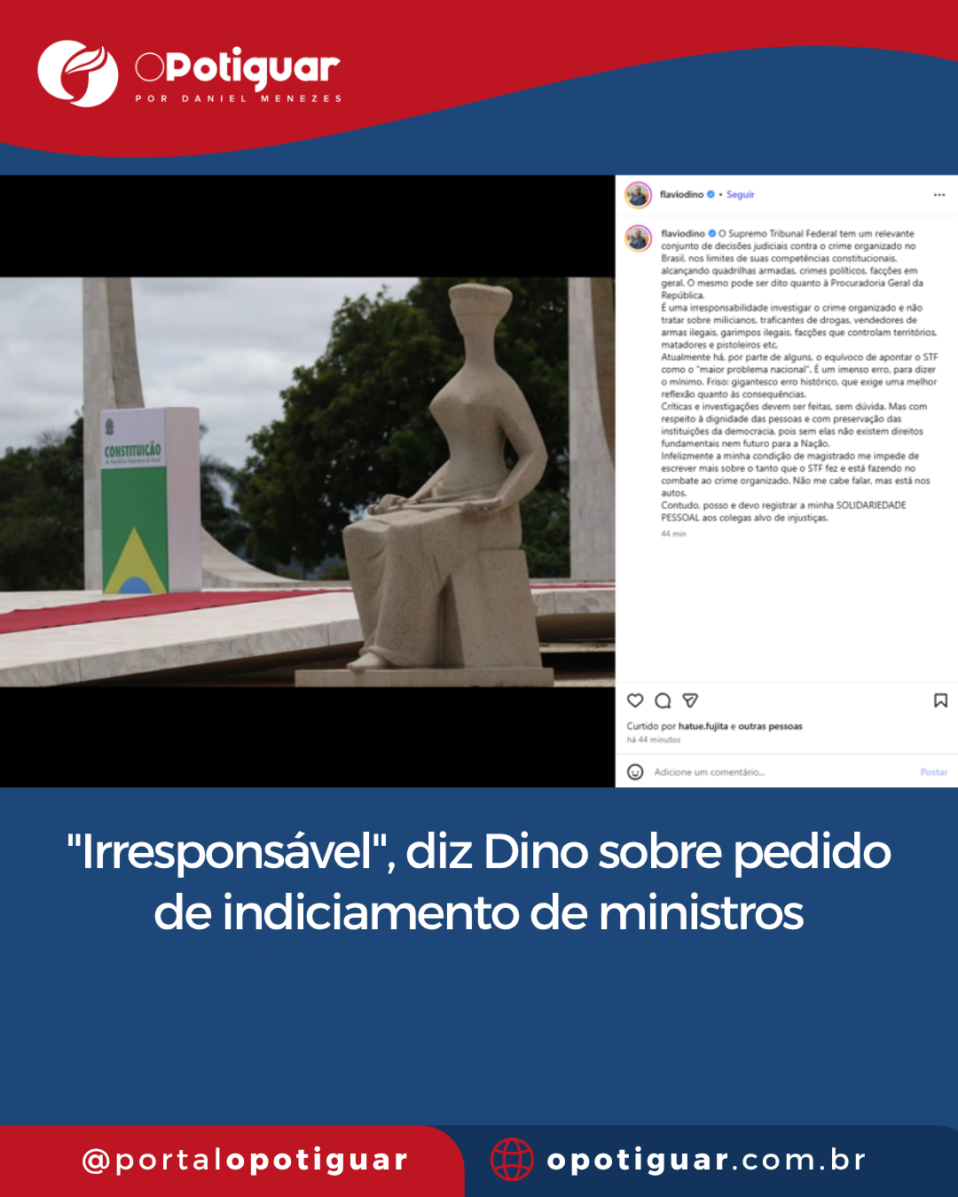 Em publicação nas redes, Dino classificou como "irresponsabilidade" uma investigação sobre o crime organizado que, segundo ele, deixa de mirar os agentes diretamente ligados à atuação das facções. "É uma irresponsabilidade investigar o crime organizado e não tratar sobre milicianos, traficantes de drogas, vendedores de armas ilegais, garimpos ilegais, facções que controlam territórios, matadores e pistoleiros etc.", escreveu. Alessandro Vieira não propôs indiciamento de integrantes de facções criminosas nem de políticos investigados por ligação com o crime organizado. Veja a manifestação de Dino: