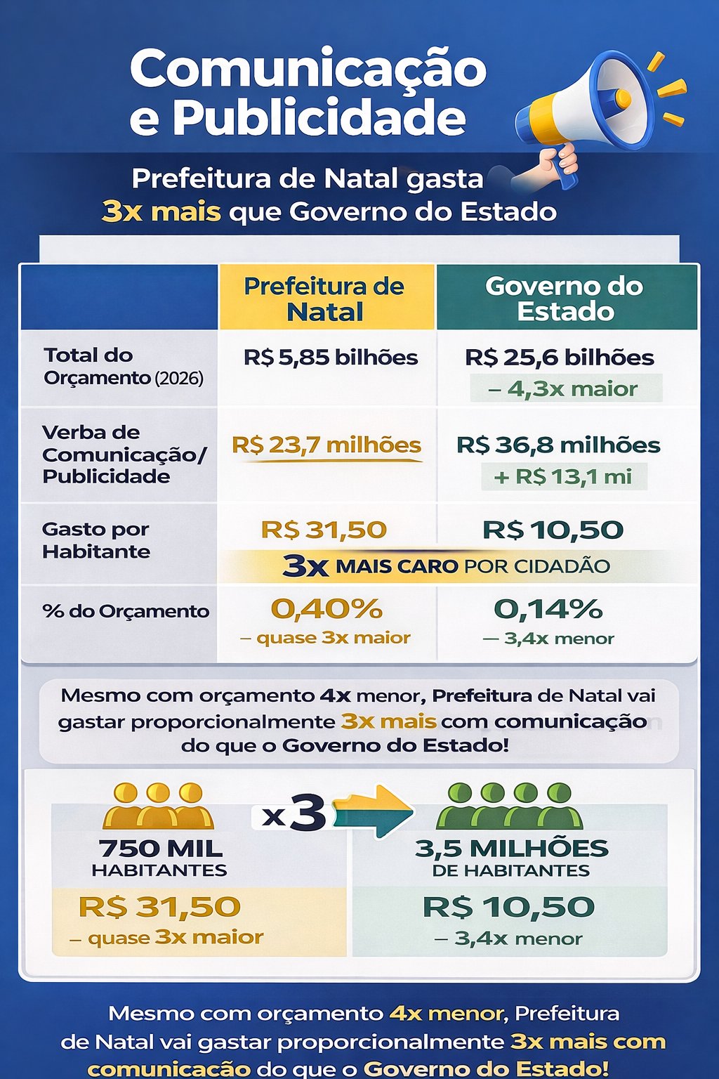 A discrepância se acentua quando se observa o tamanho dos orçamentos. Em Natal, os R$ 23,7 milhões correspondem a cerca de 0,40% de um orçamento total de R$ 5,85 bilhões. No caso do Estado, os R$ 36,8 milhões representam aproximadamente 0,14% dos R$ 25,6 bilhões previstos para 2026. Ou seja, proporcionalmente, a Prefeitura destina quase três vezes mais recursos à publicidade do que o Governo do RN em relação ao seu orçamento total, evidenciando uma prioridade mais elevada da gestão municipal nessa área. A prefeitura se comunicará, por motivos óbvios, com uma cidade. O governo do RN com 167 municípios.